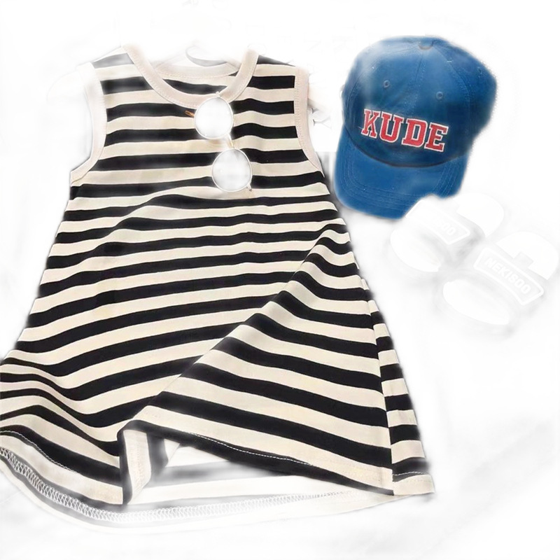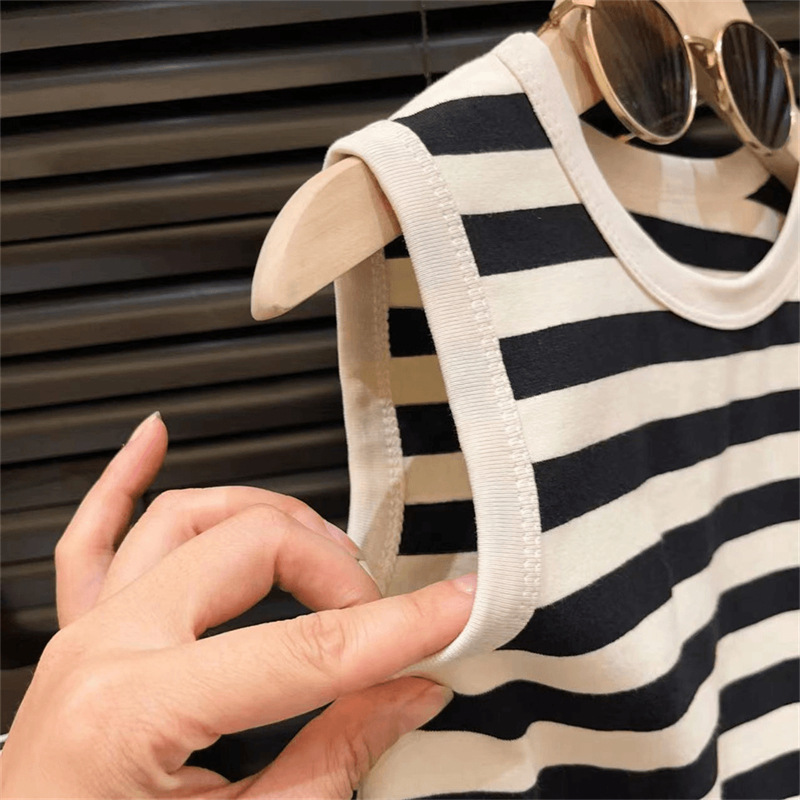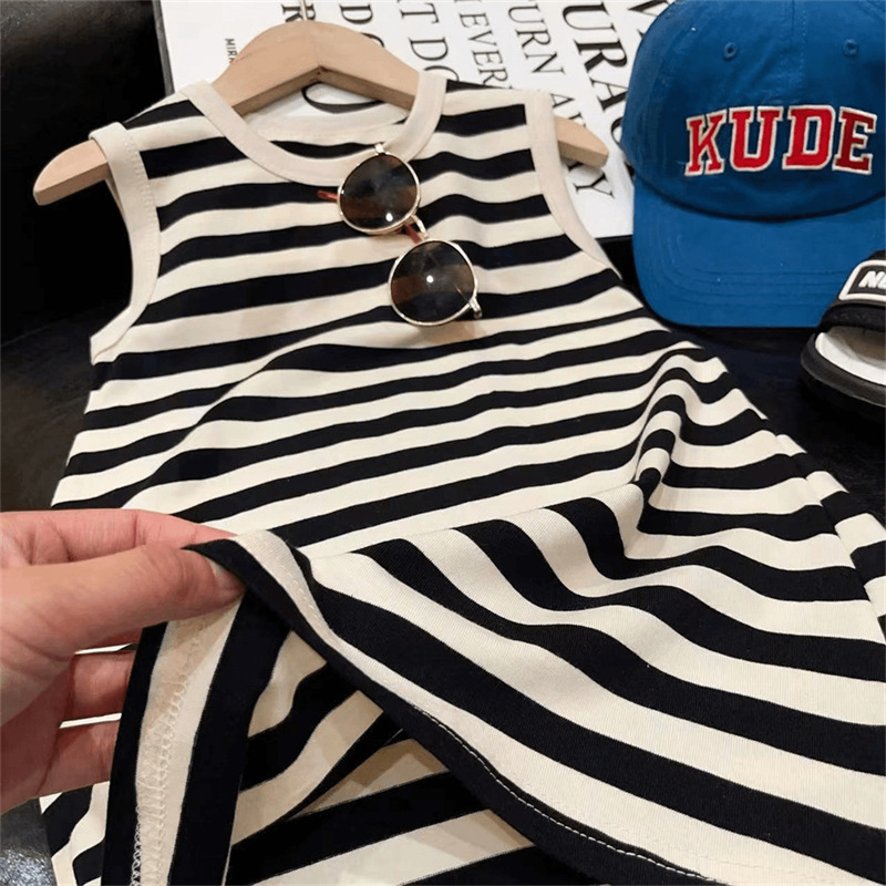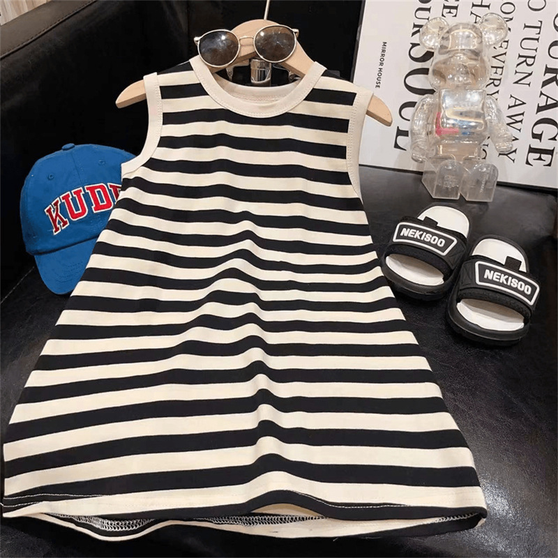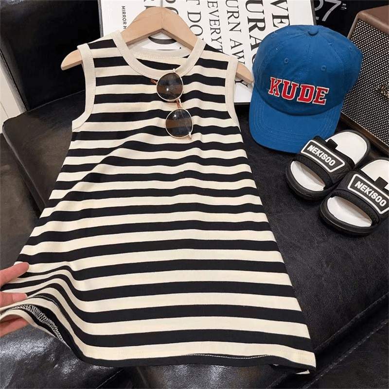 2025夏季新款韩版洋气女童黑白色条纹无袖连衣裙女孩夏长款童裙潮