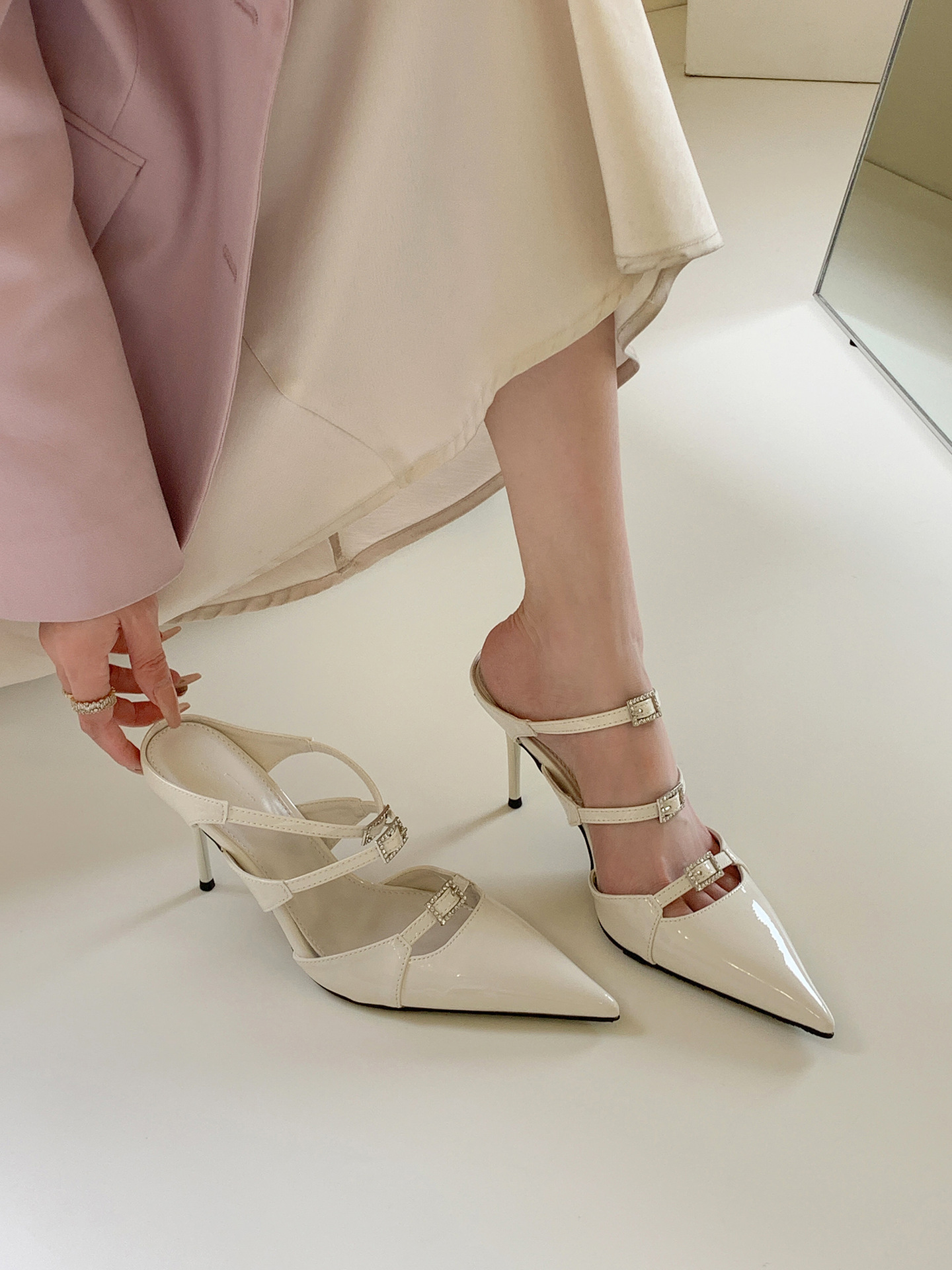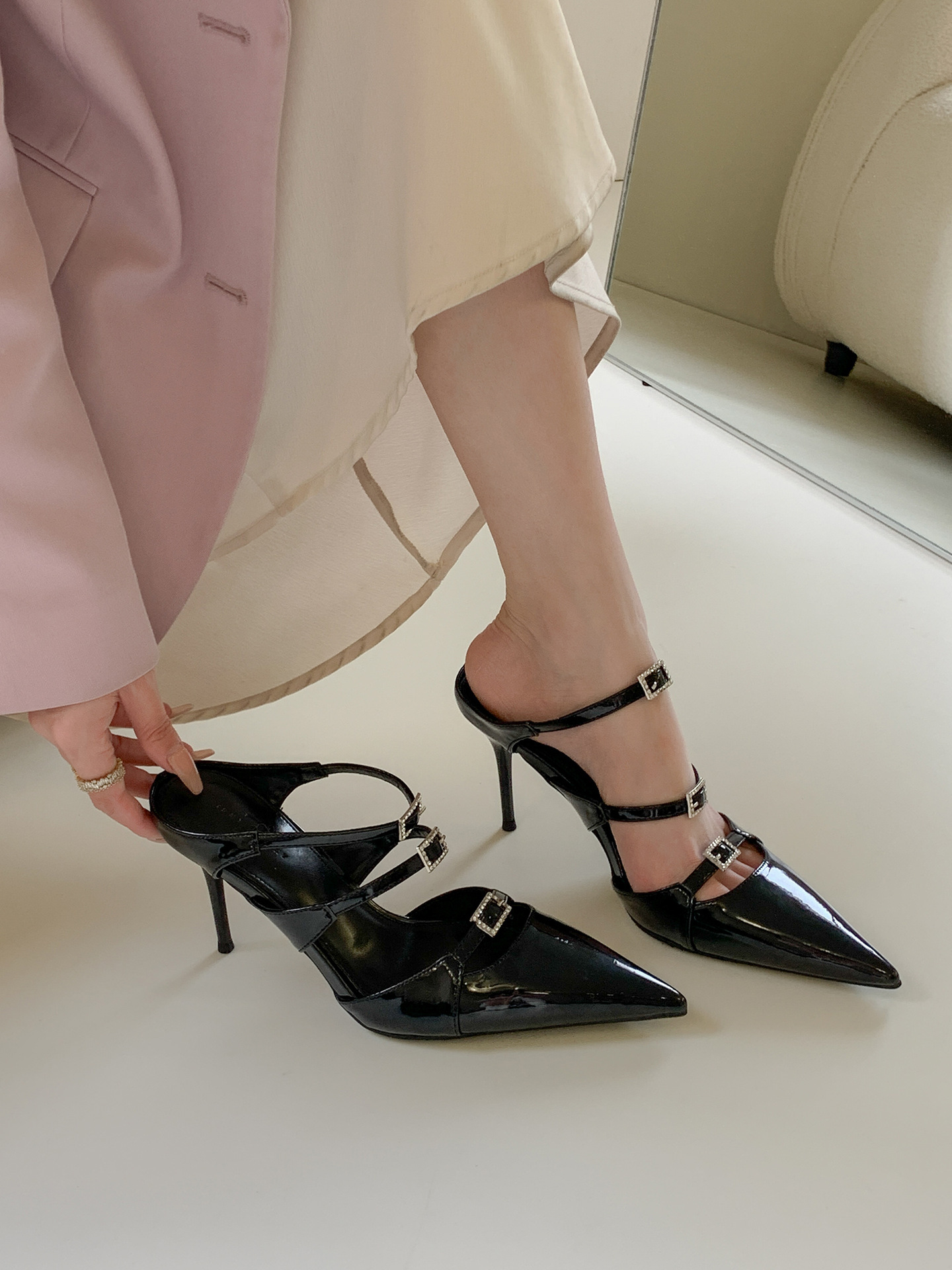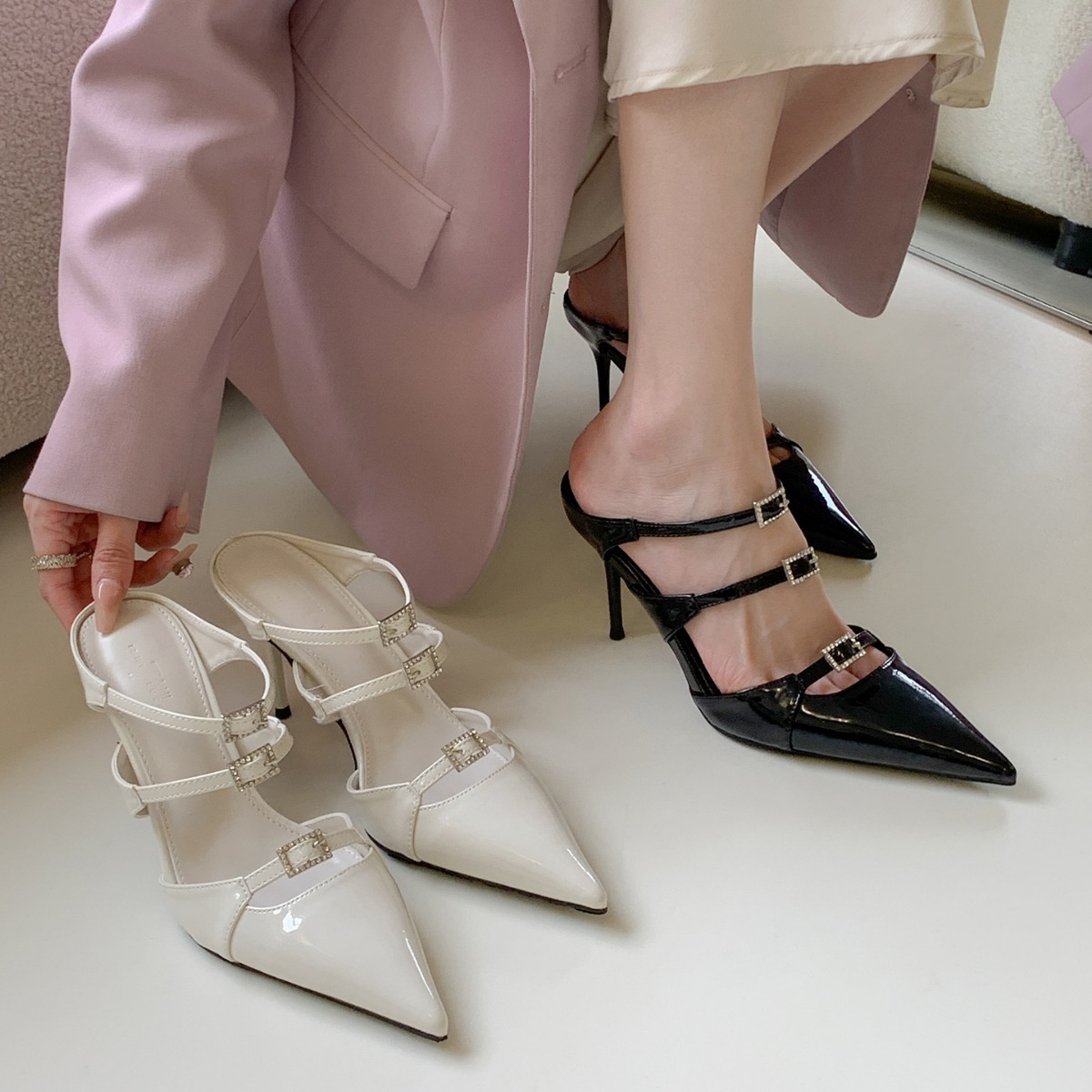 白月光气质尖头高跟半拖鞋女细跟包头一字水钻穆勒鞋