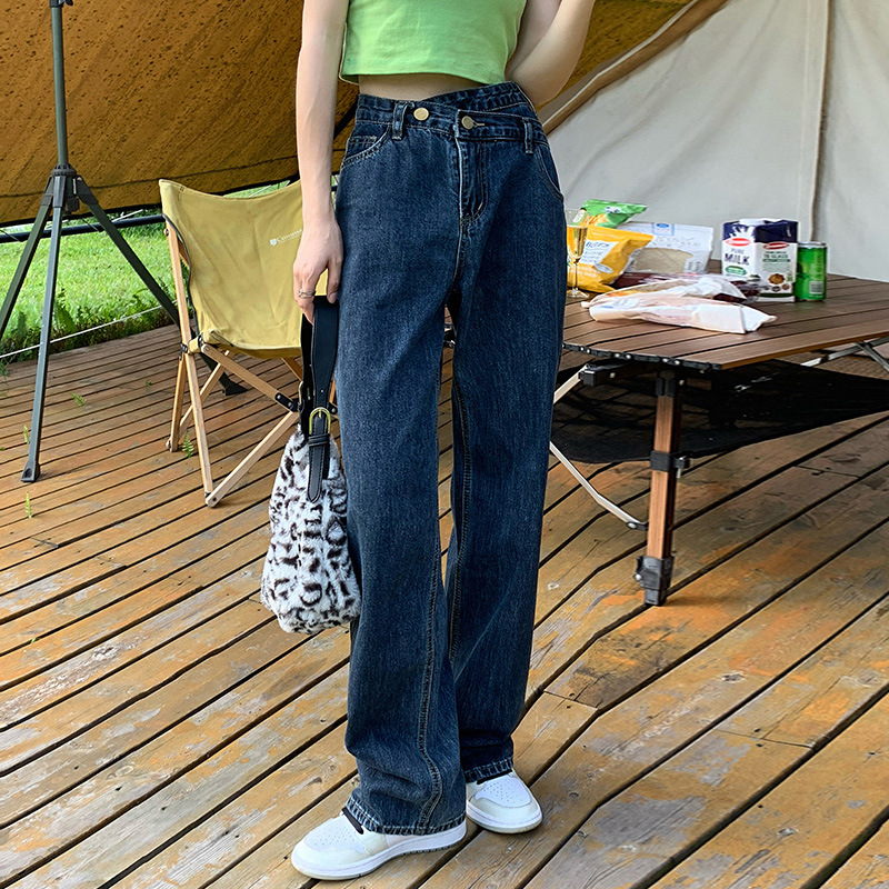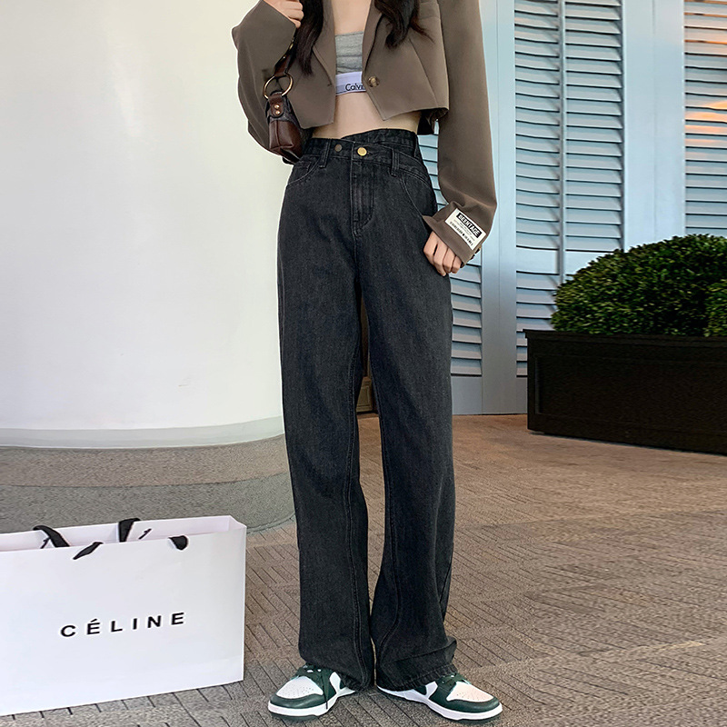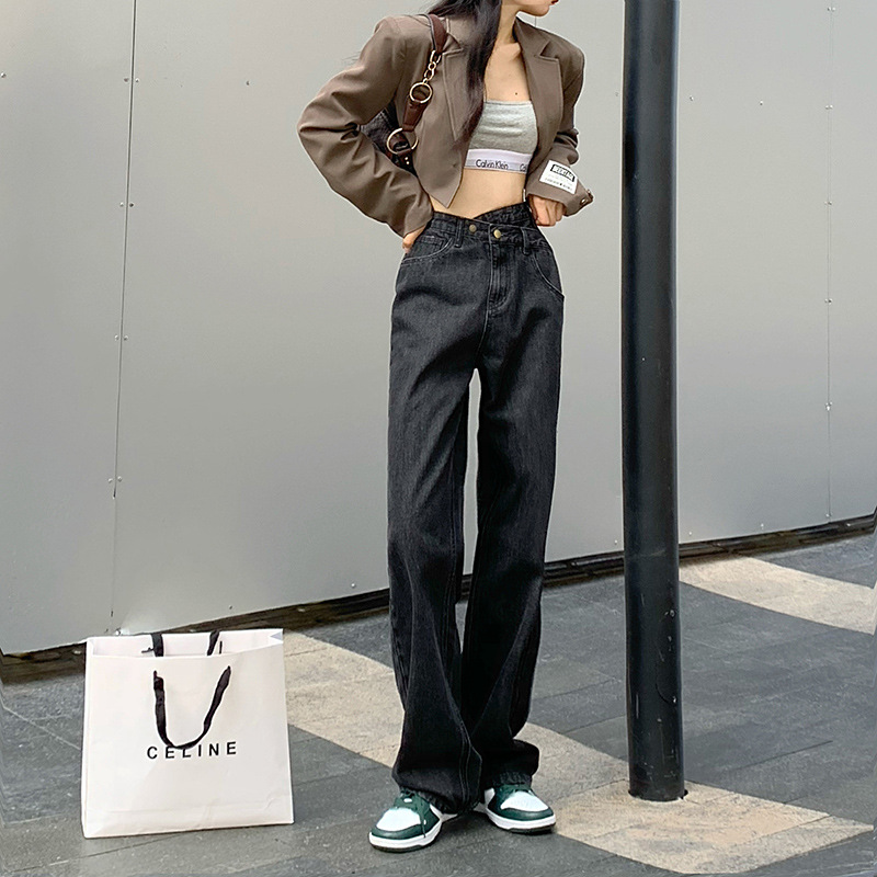 设计感不规则直筒宽松牛仔裤女秋季新款高腰阔腿显瘦拖地裤