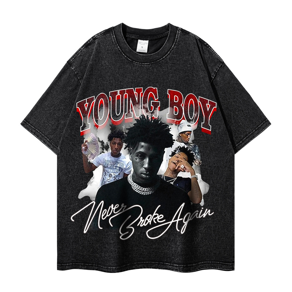 夏季欧美嘻哈说唱重磅小领口复古半袖水洗直喷印花T恤男宽松大码