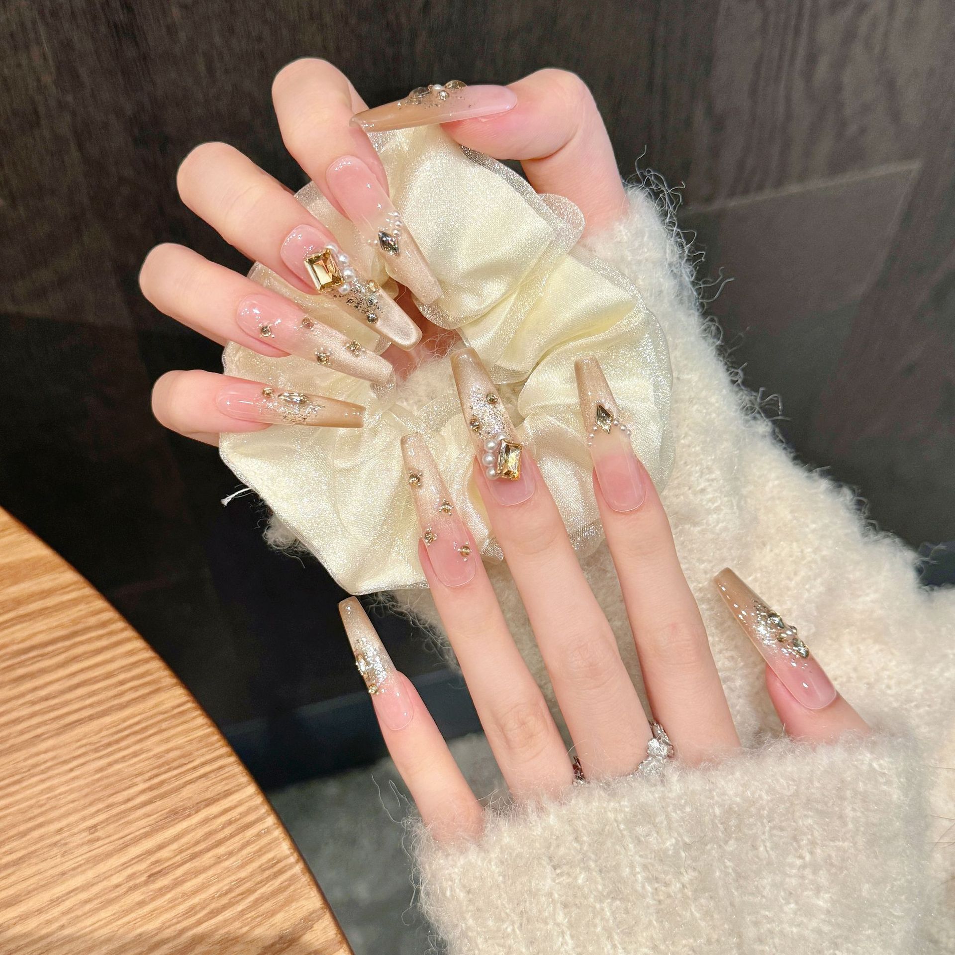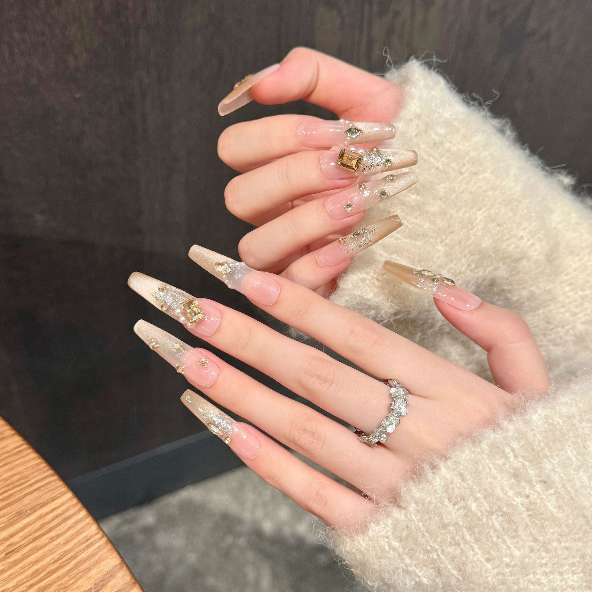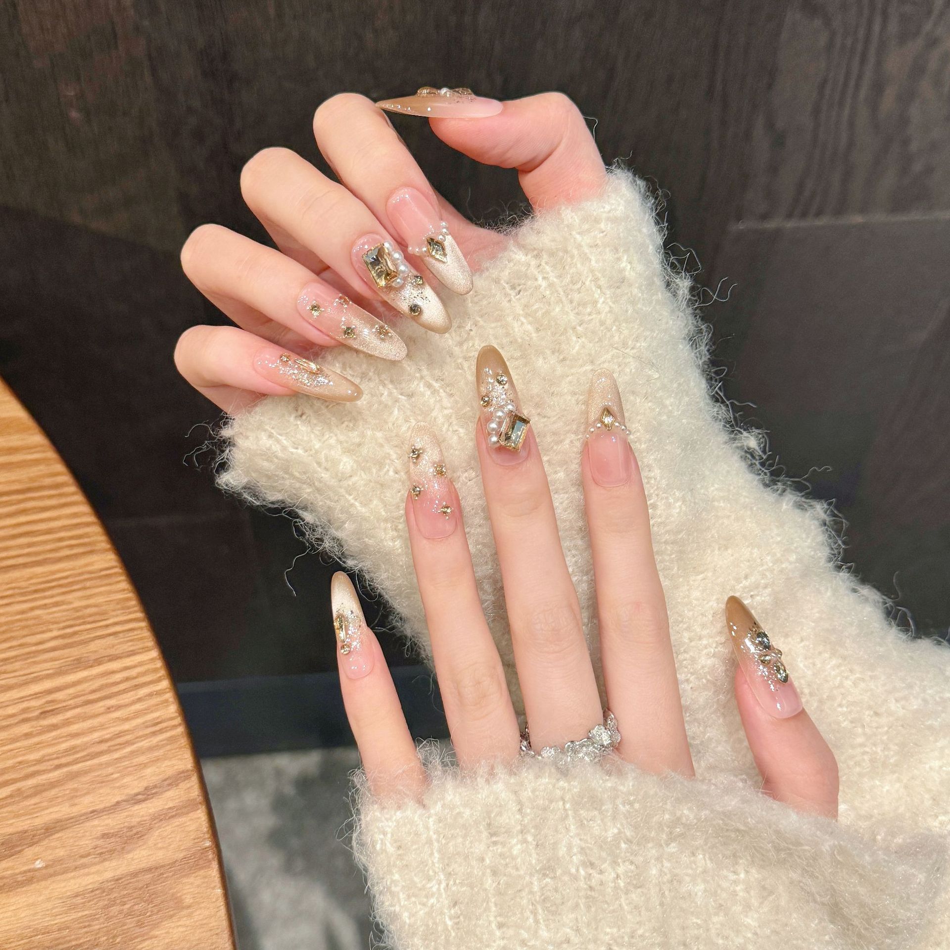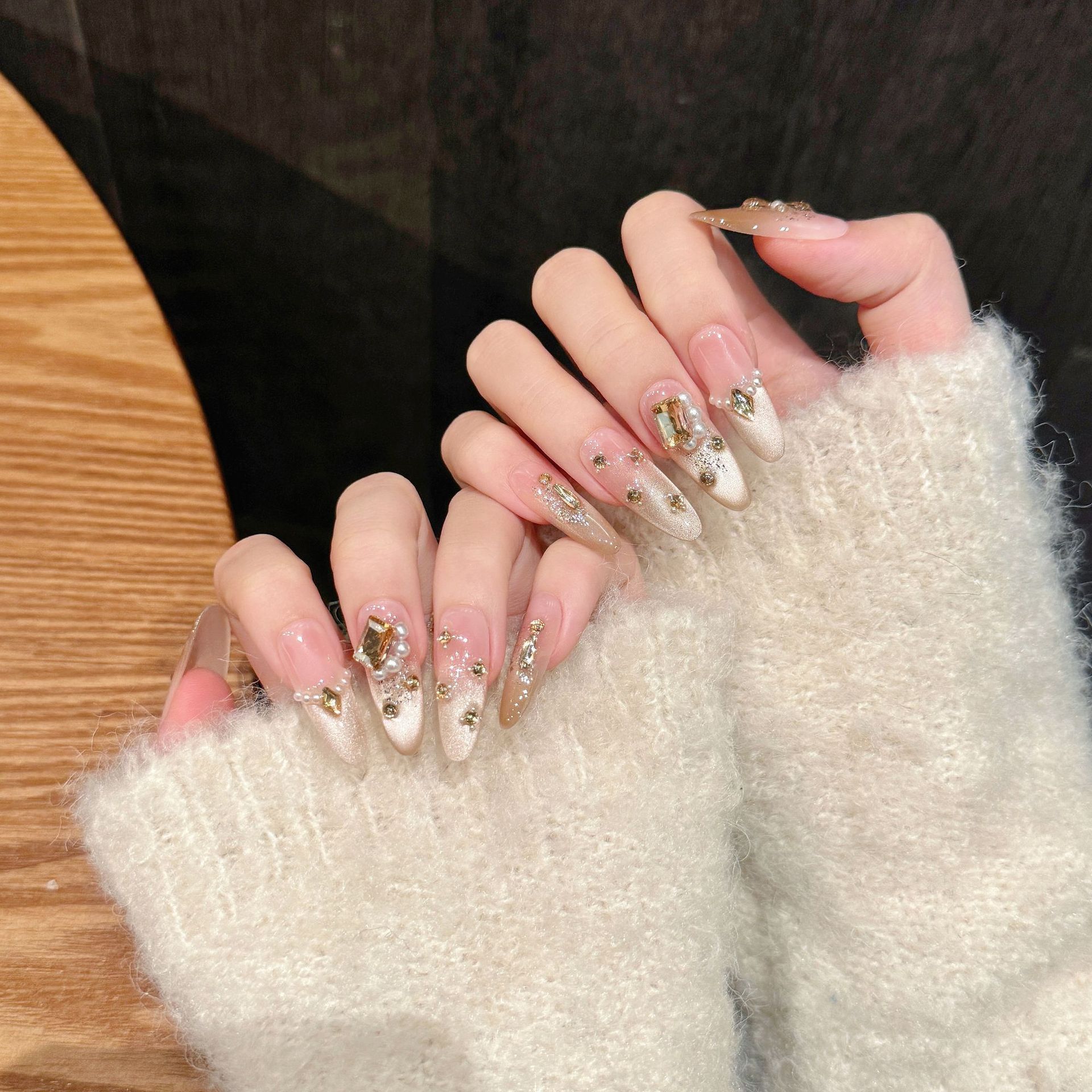 艺禾 秋冬香槟美拉德猫眼千金爆闪气质高级品质穿戴甲长款美甲