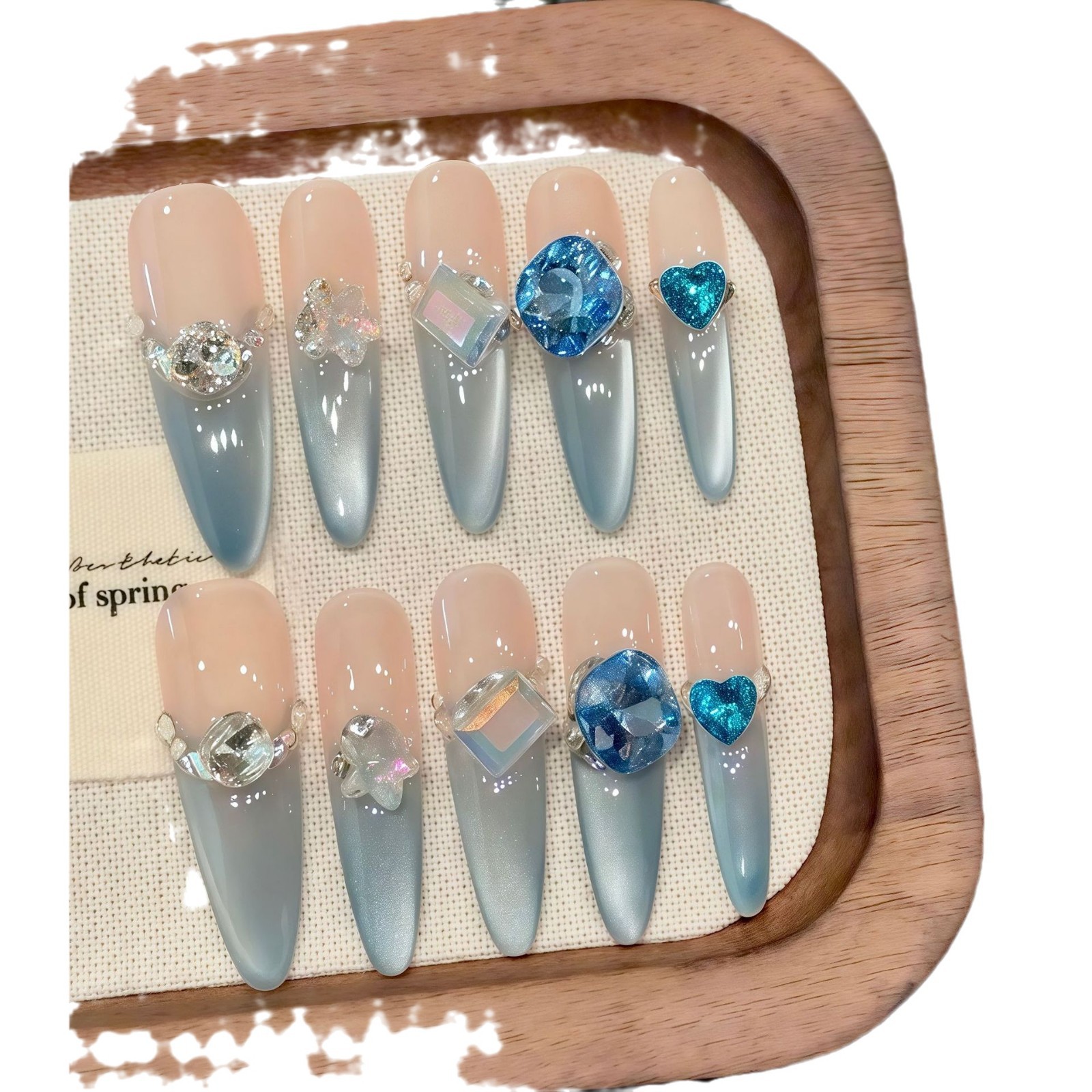 艺禾 海蓝宝法式渐变侧光猫眼小碎钻爆闪蓝色多瑙河光疗穿戴甲