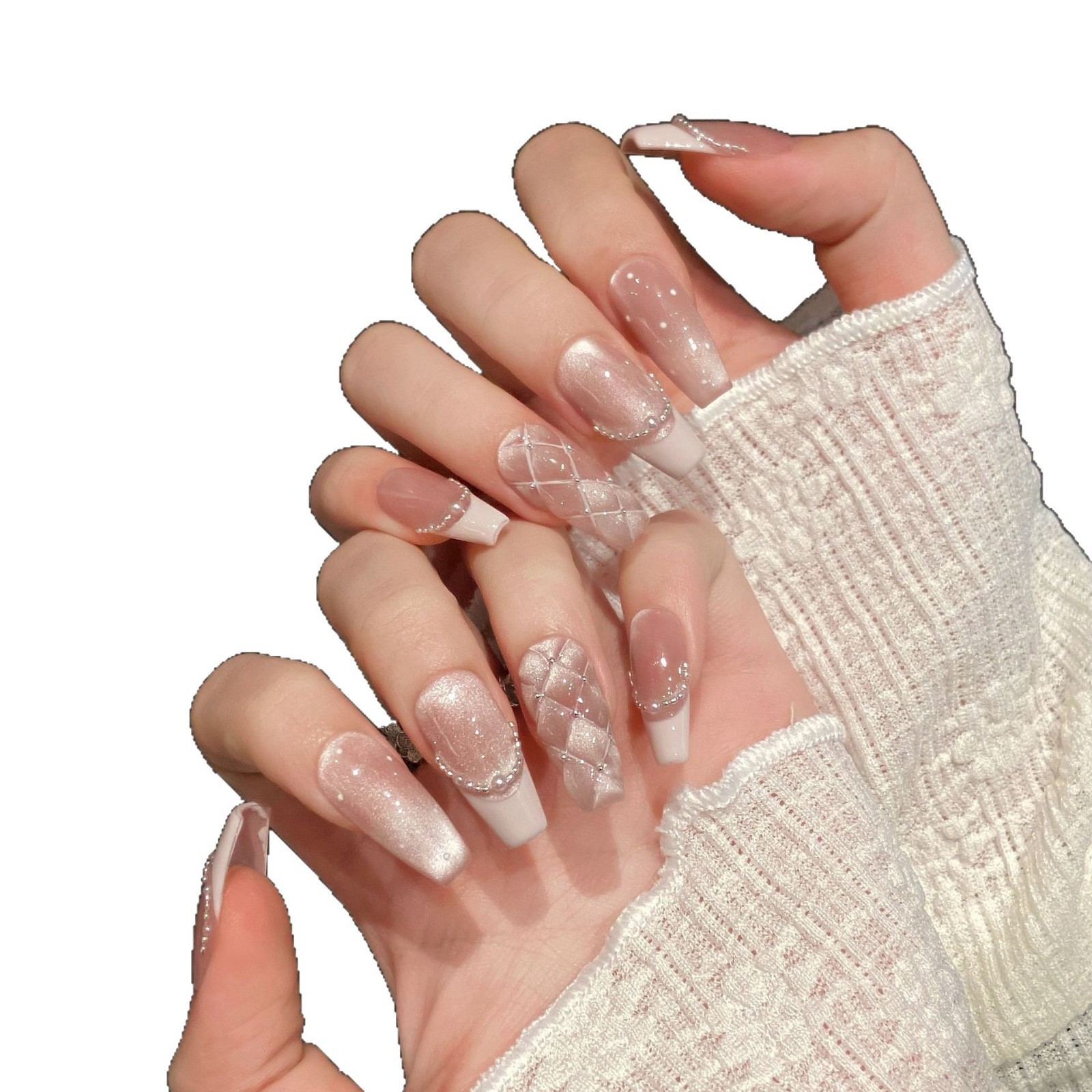 艺禾美甲 网红温柔菱格法式珍珠粉猫眼蝴蝶结纯欲纯手工穿戴甲