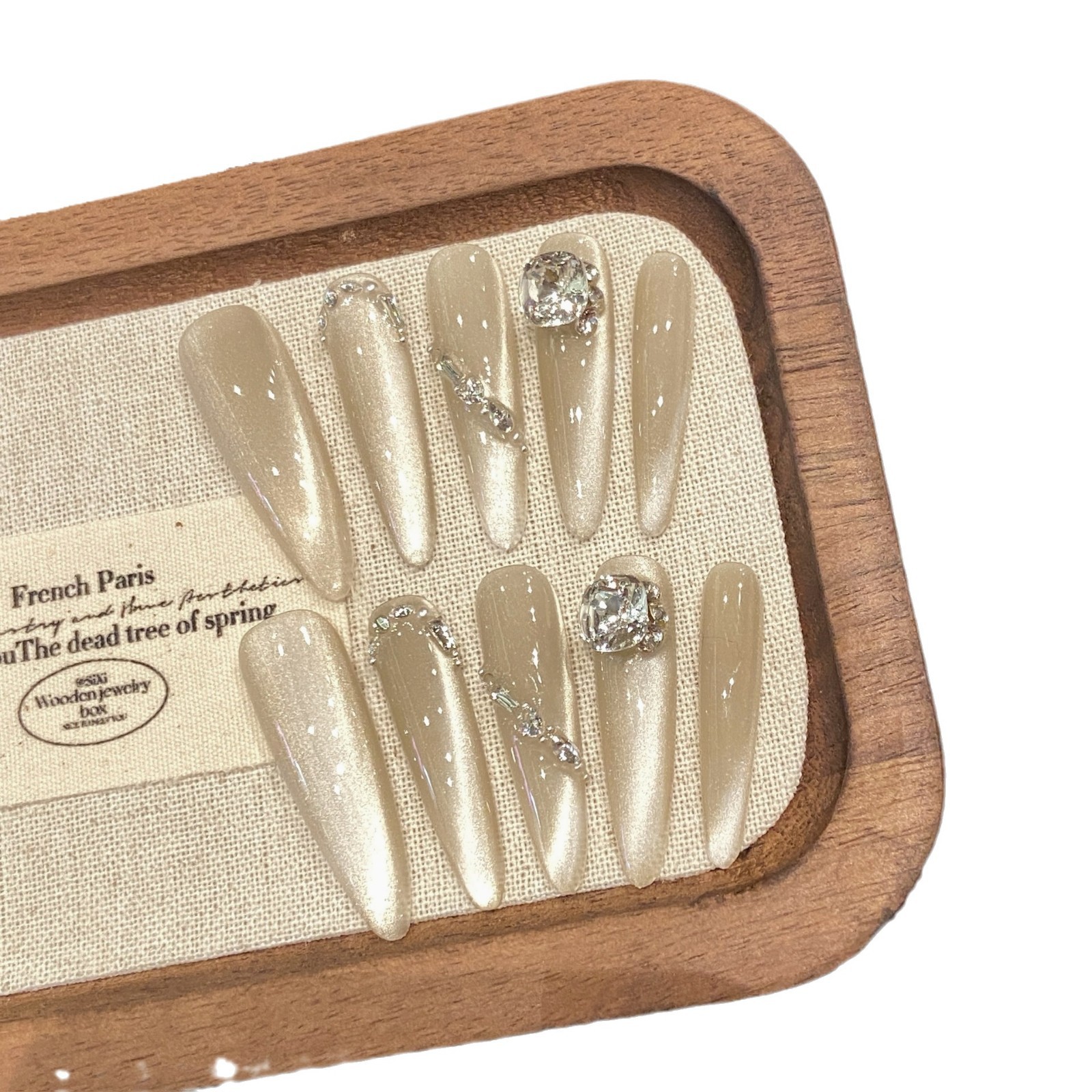艺禾美甲 纯欲侧光猫眼链条堆钻香槟摇曳k9椭圆钻高级感穿戴甲