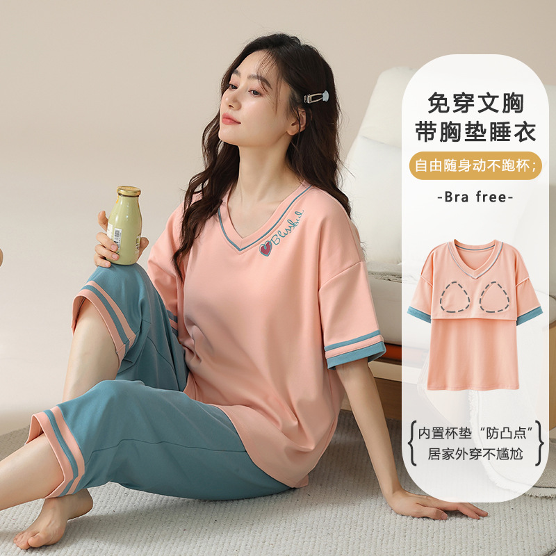 睡衣女夏季纯棉薄款短袖七分裤带胸垫一体外穿大码全棉家居服套装