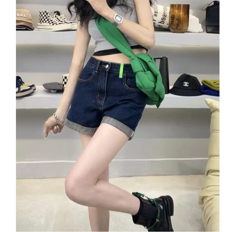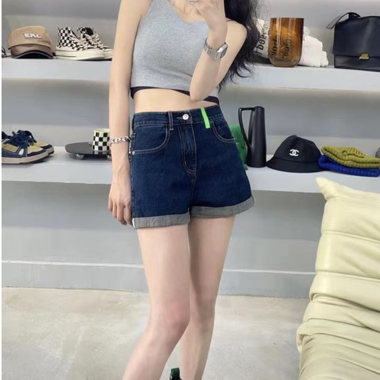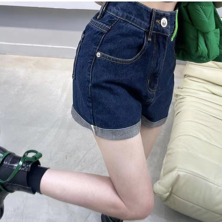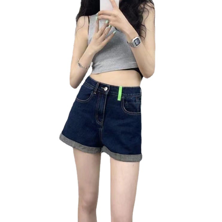 夏季新款韩版时尚深蓝色弹力高腰显瘦卷边阔腿a字牛仔短裤女