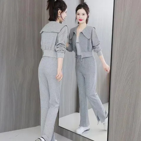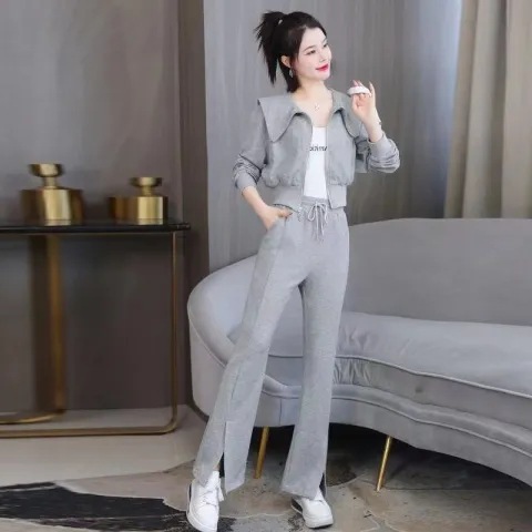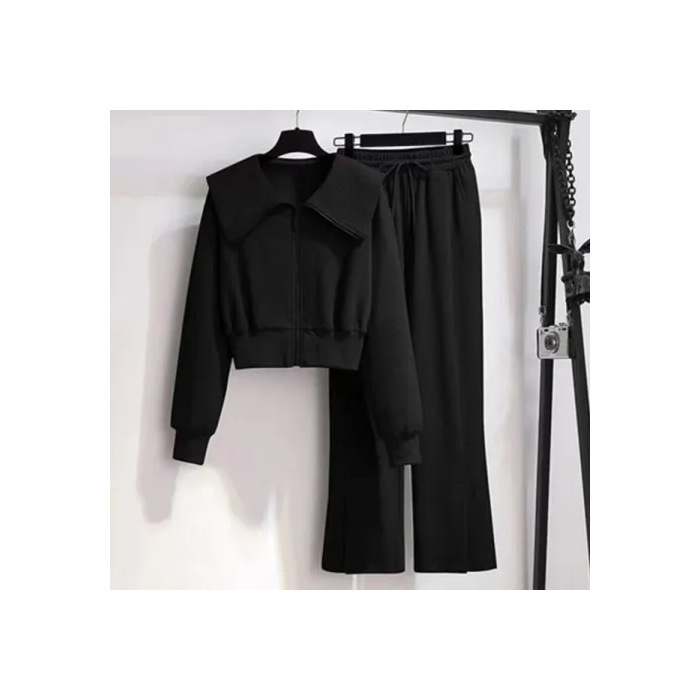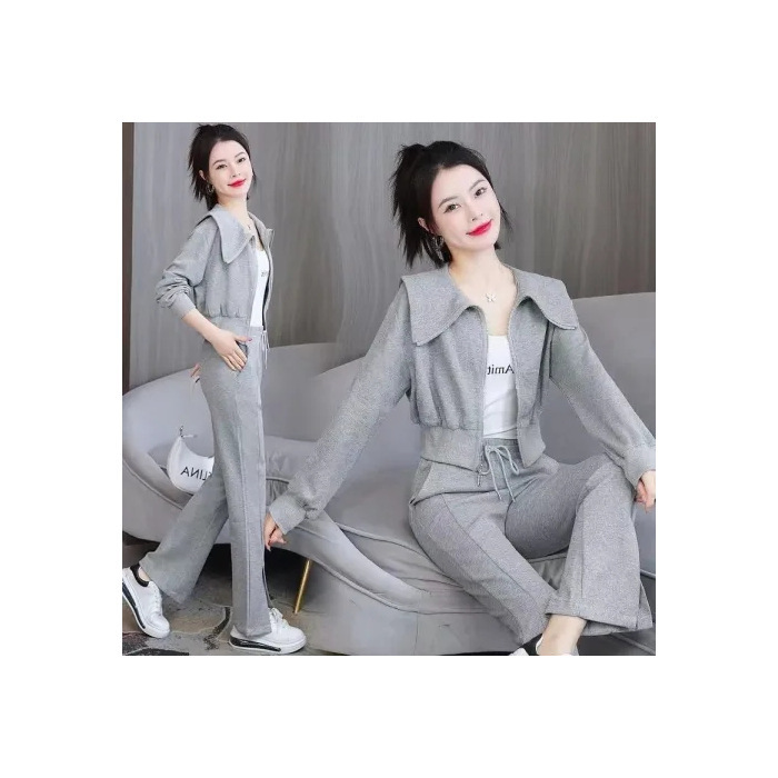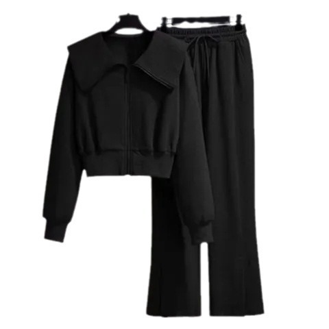 时尚百搭新款长袖外套卫衣高腰阔腿裤休闲运动两件套女ins潮
