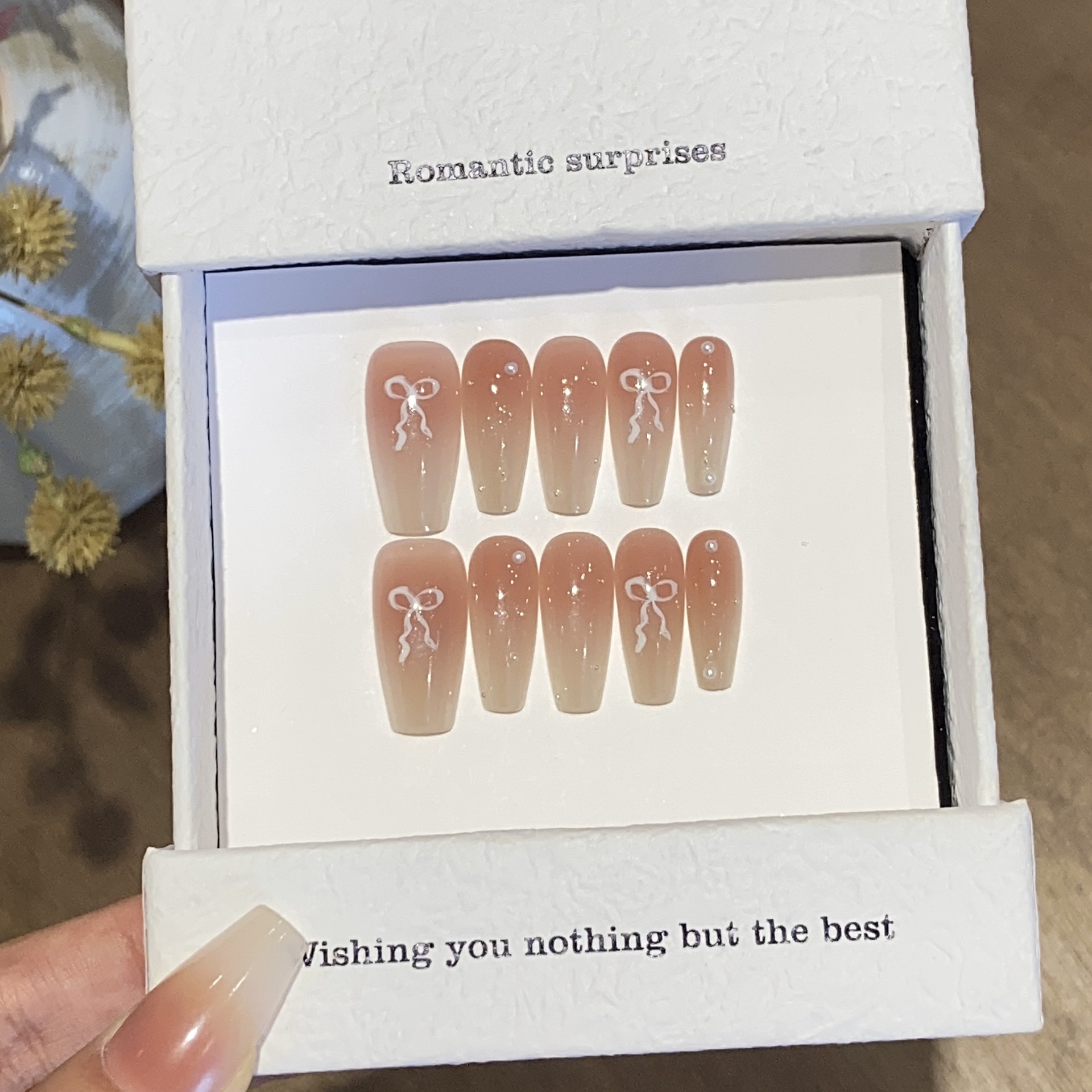 一只顾美甲 高级冰透奶茶色渐变蕾丝蝴蝶结浪漫主义贴片穿戴甲