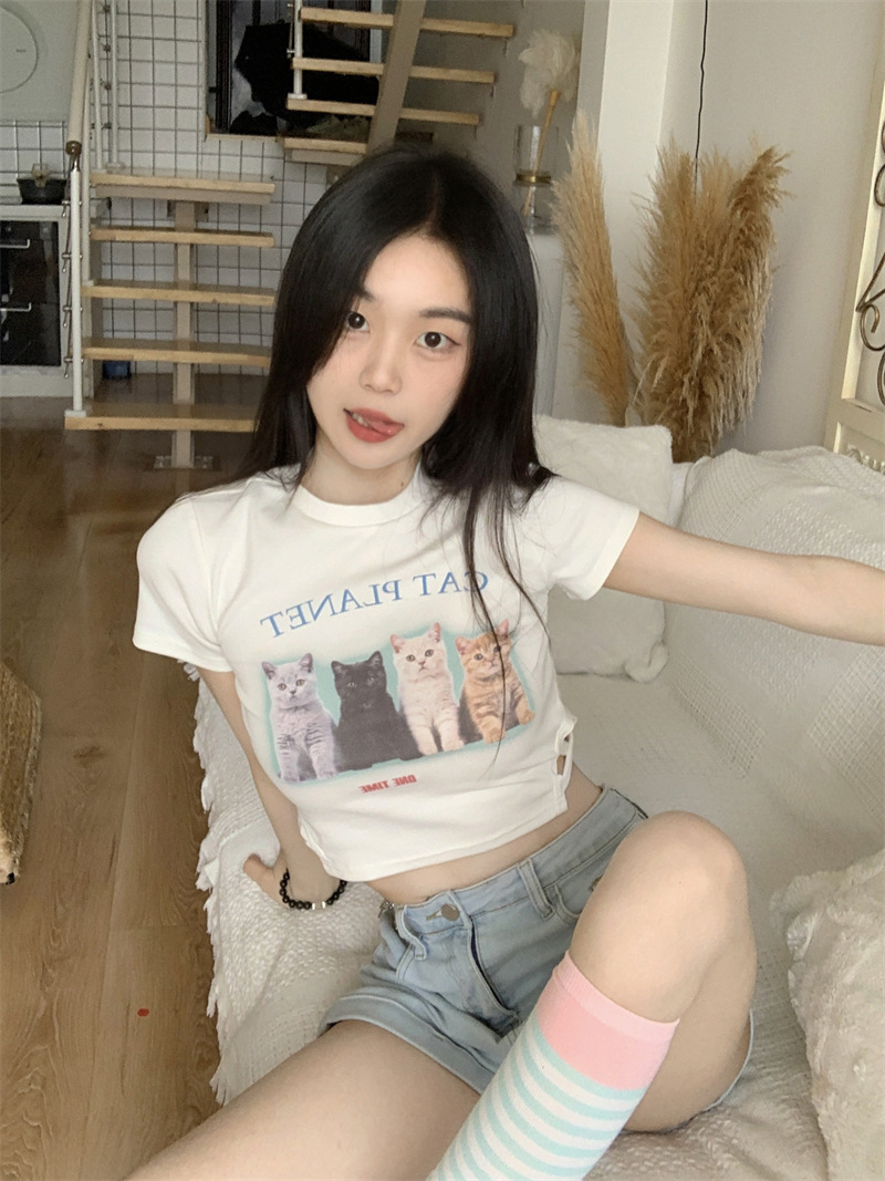 猫咪印花修身白色短袖T恤女夏季甜辣露脐短款学生打底上衣潮