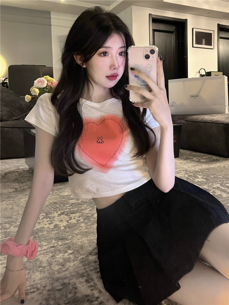 短袖t恤女ins潮夏季设计感甜辣妹爱心高腰露脐短款学生上衣女