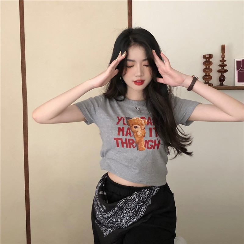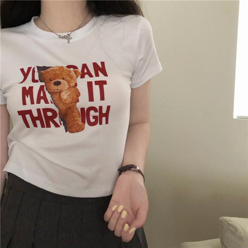 夏季新款韩版字母小熊印花短袖T恤女修身短款上衣女装