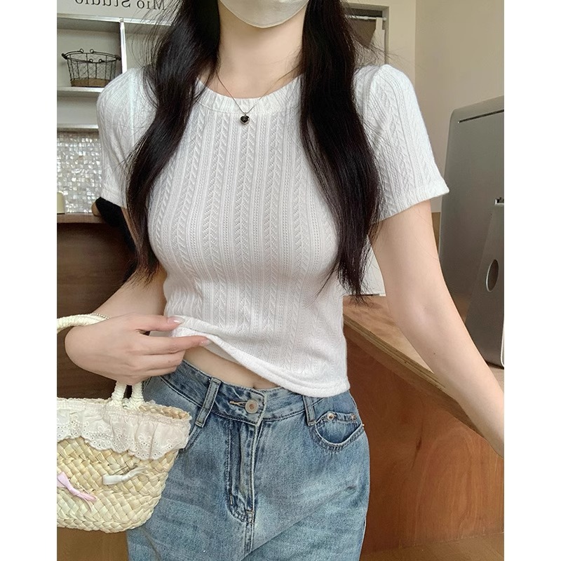 韩版夏季百搭纯色上衣短款修身圆领显白正肩短袖甜辣妹T恤女