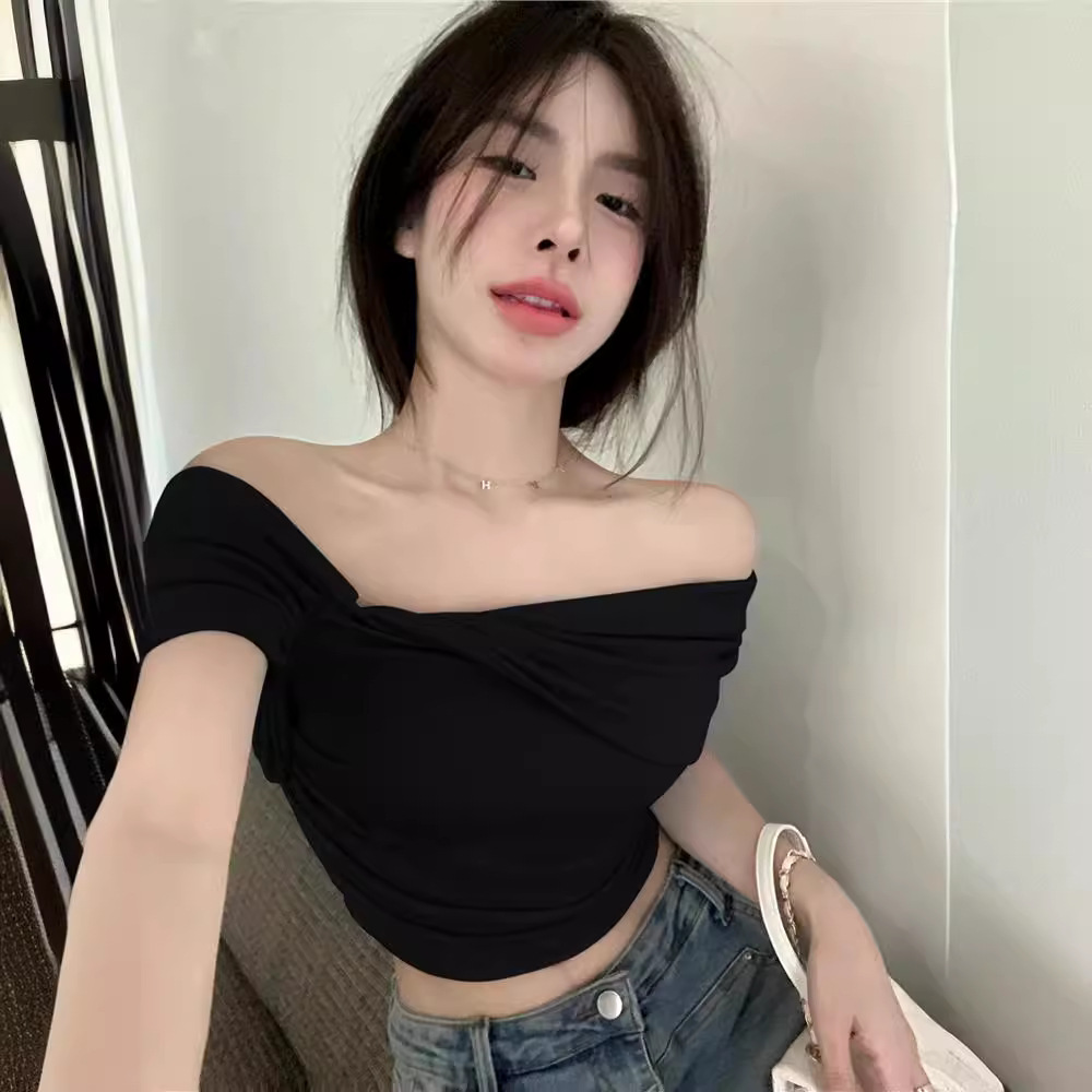 扭结一字肩短袖T恤女夏季纯欲辣妹内搭漏肩紧身别致短款上衣