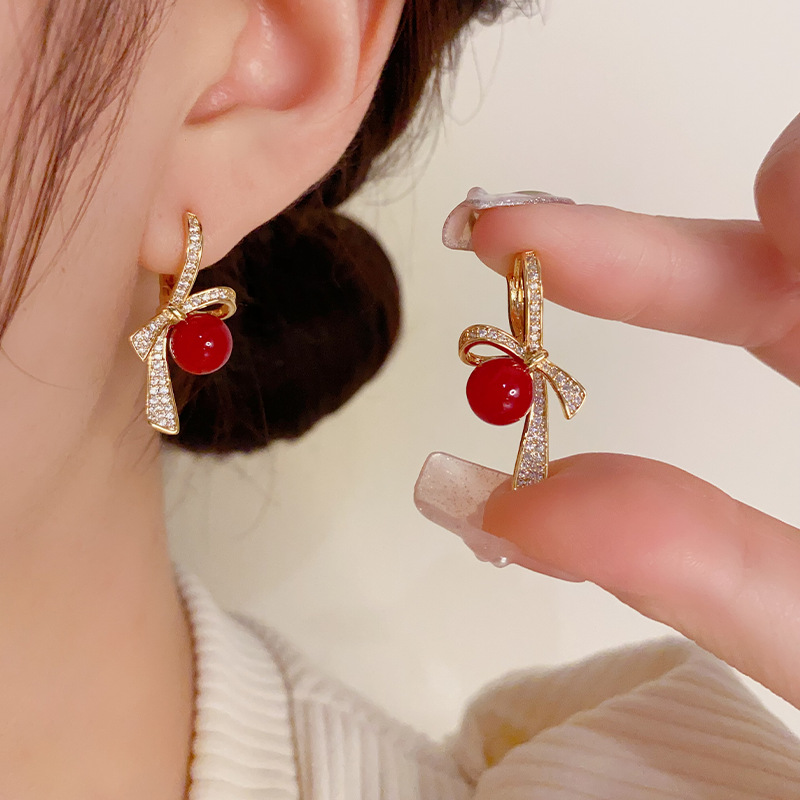 韩式优雅复古蝴蝶结红色珍珠耳扣秋冬款小众设计感时尚高级感耳环