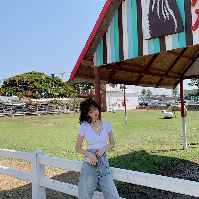 短袖t恤女夏季新款深V领外穿低胸韩版修身露脐短款学生上衣潮