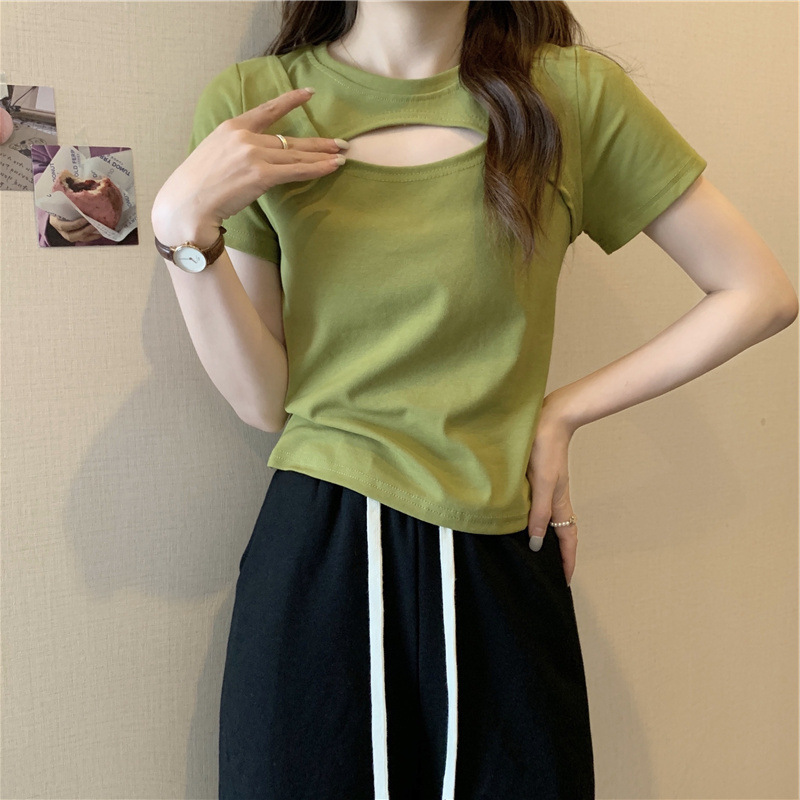 镂空短袖T恤女夏季韩版新款小心机修身显瘦糖果色学生上衣女