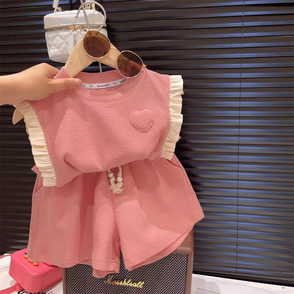 新品女童木耳花边华夫格爱心背心短裤洋气两件套2025夏装小童套装