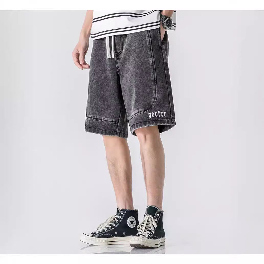 夏季薄款松紧腰五分牛仔短裤男式中裤潮牌宽松青年牛仔五分裤男生