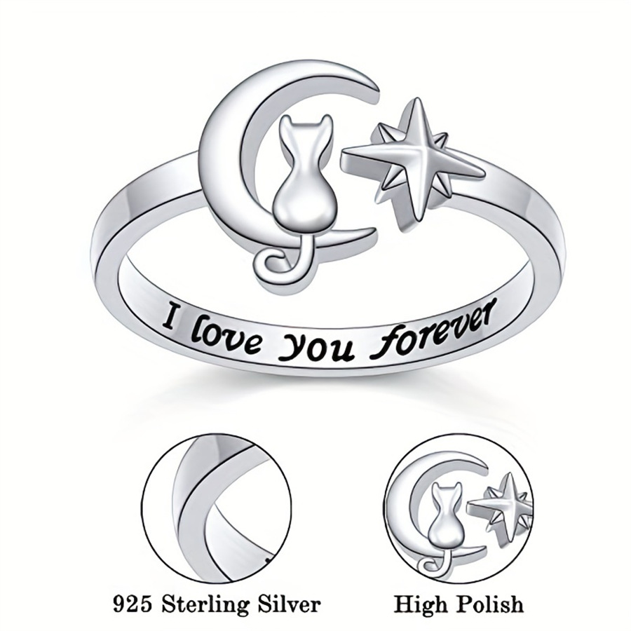925S纯银猫月亮个性戒指我永远爱你可调节低过敏女士开口戒指