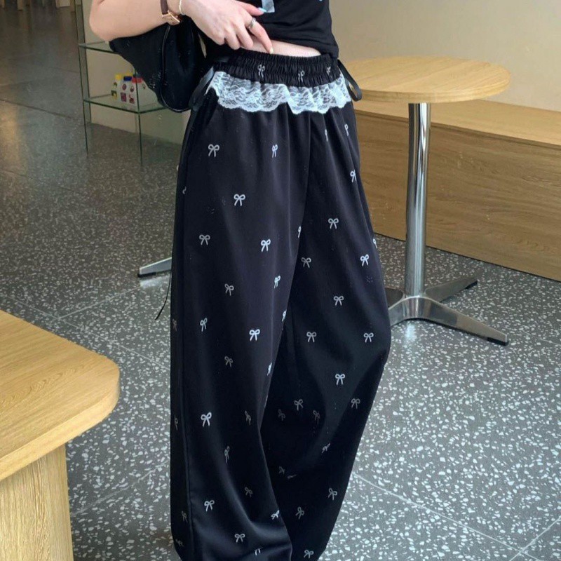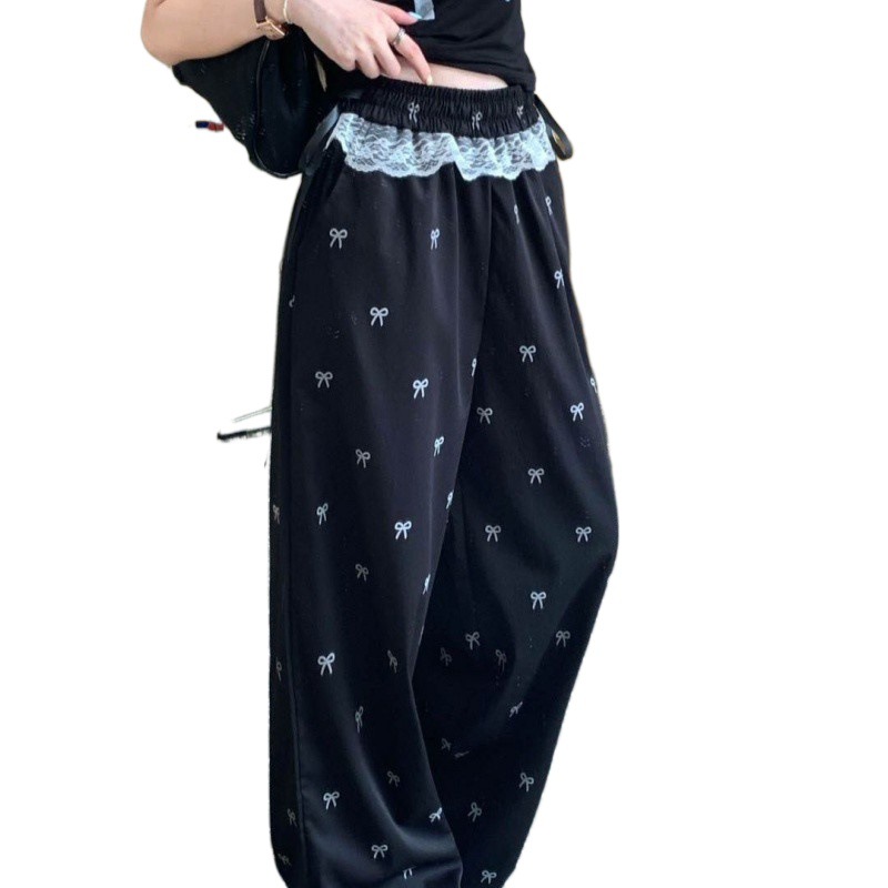 甜辣妹蕾丝边拼接休闲裤蝴蝶结裤子女夏季宽松松紧腰阔腿裤直筒裤