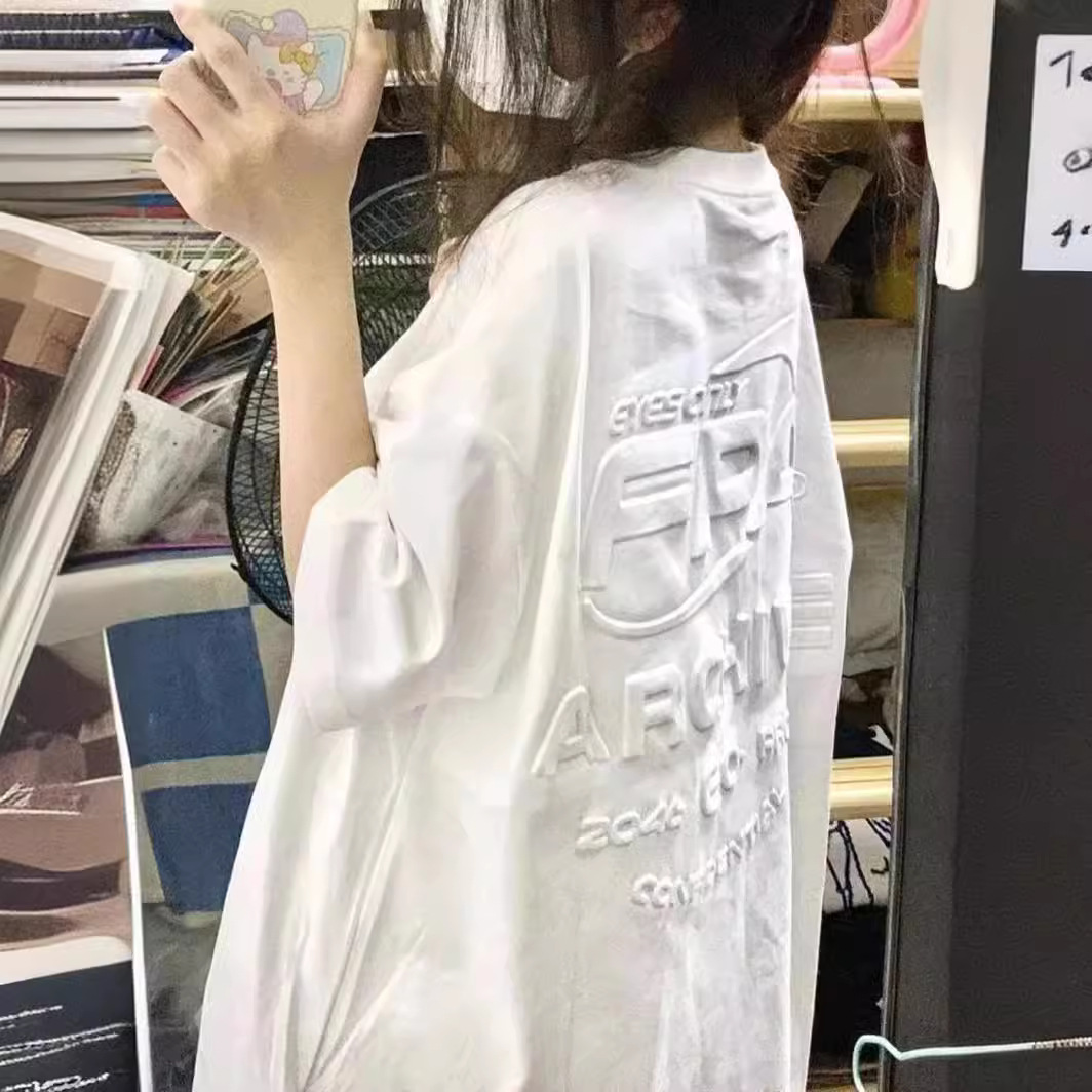 100%纯棉国潮字母压花短袖t恤女学生宽松白色百搭半袖上衣服夏季