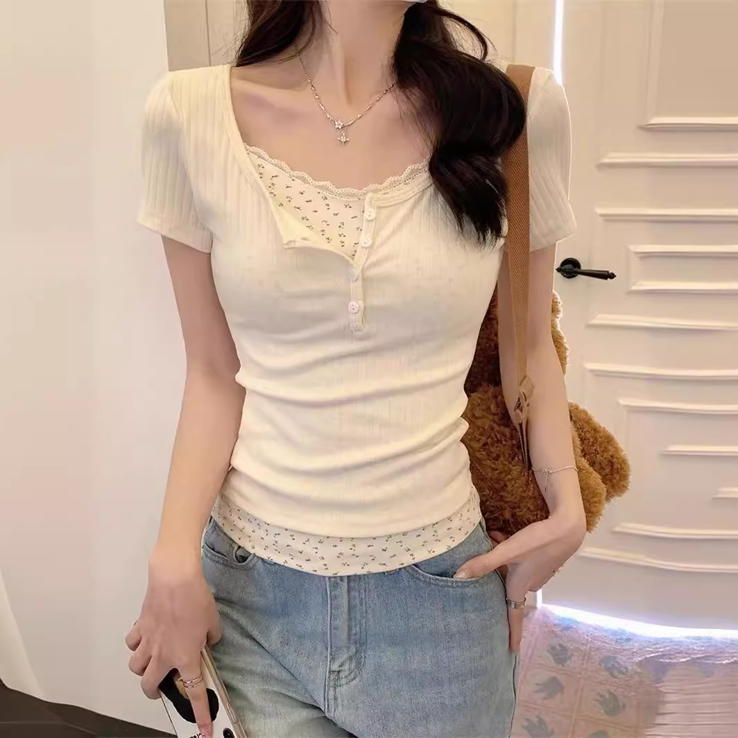 假两件碎花bm短袖t恤女春夏新款设计感蕾丝边修身显瘦半开领上衣