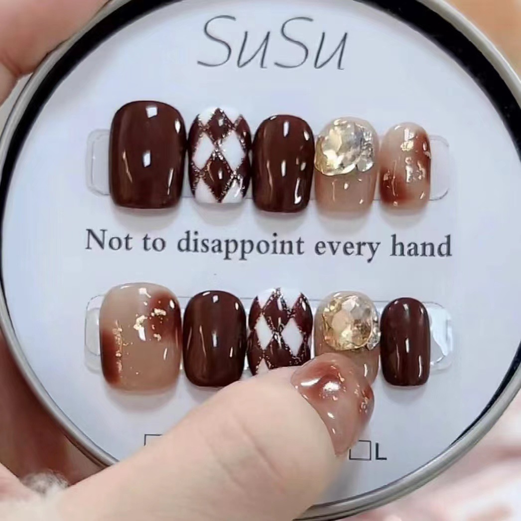 纯手工光疗穿戴甲菱形格穿戴甲批发成品重复使用美甲贴片可拆卸