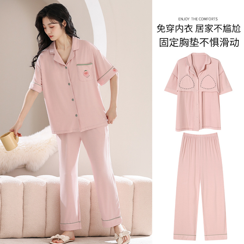 莫代尔睡衣女夏季短袖长裤简约纯色带胸垫可外穿家居服新款