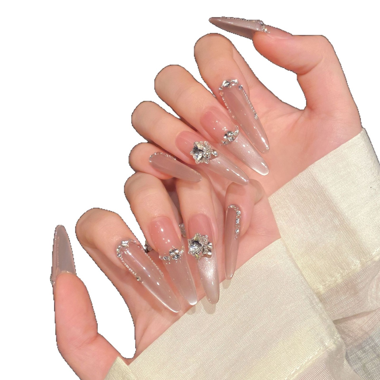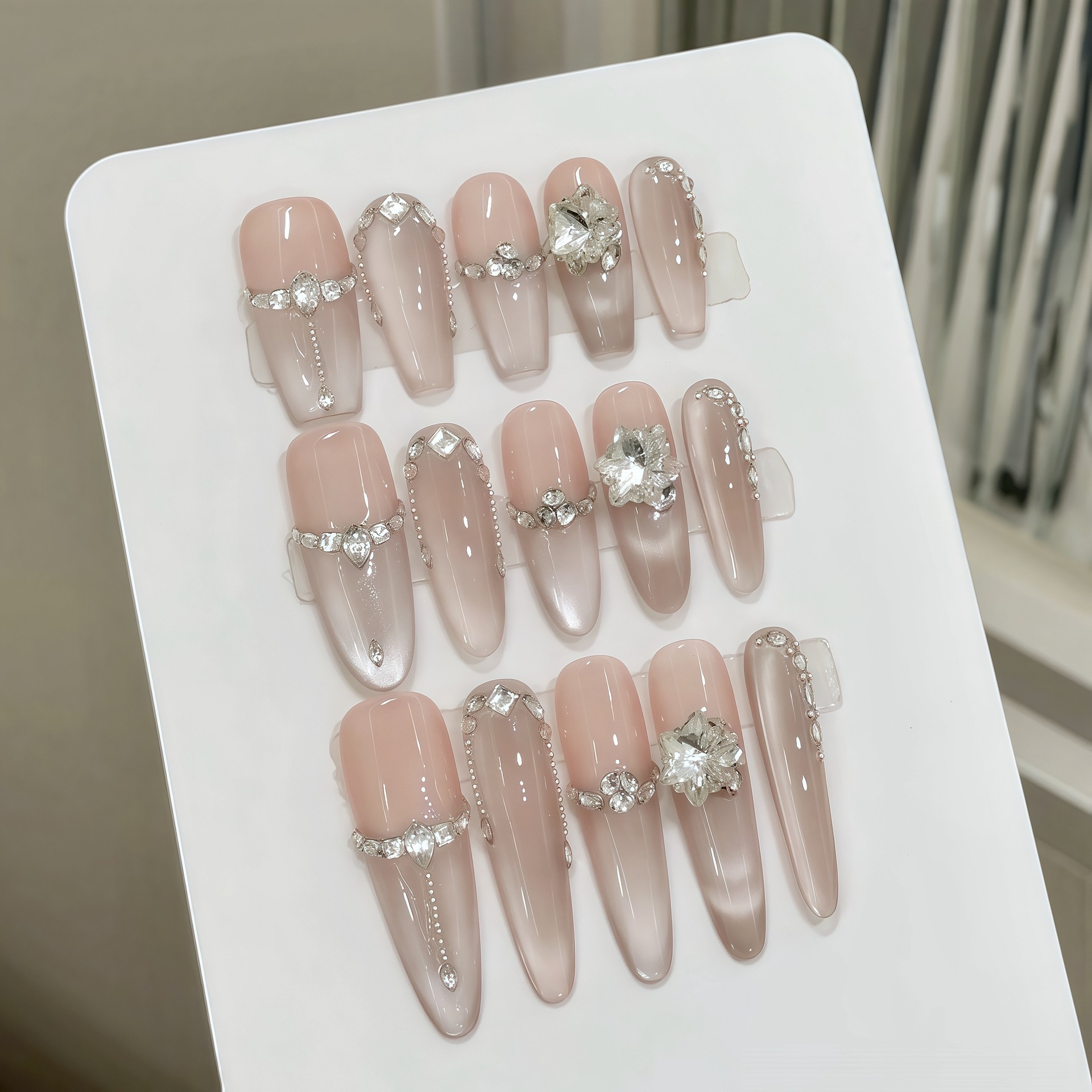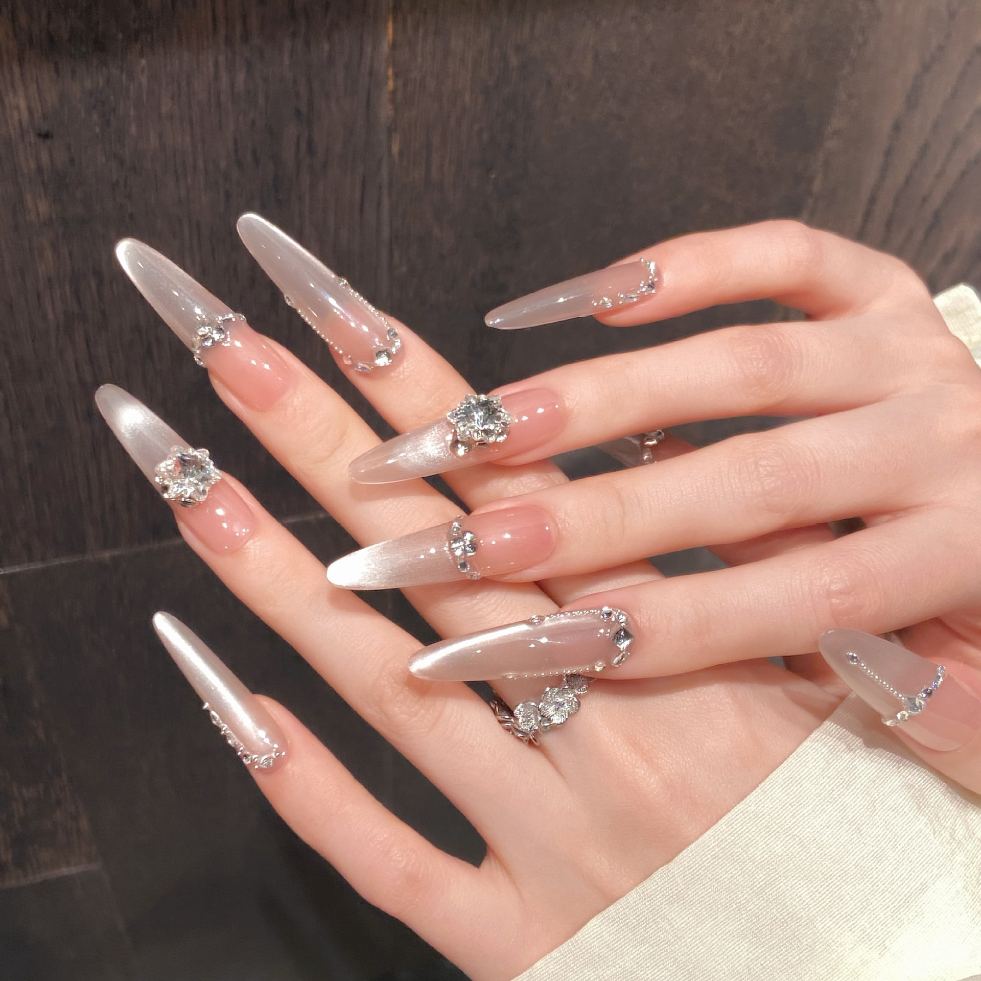 纯手工美甲穿戴甲假指甲贴片银色追光猫眼浪漫白色腮红爆闪钻