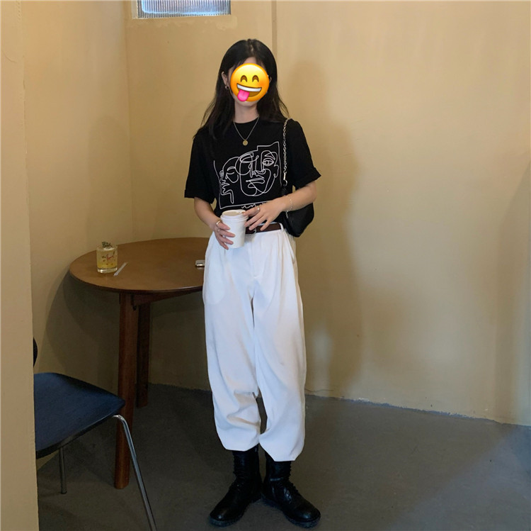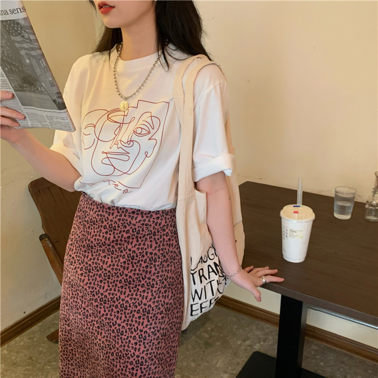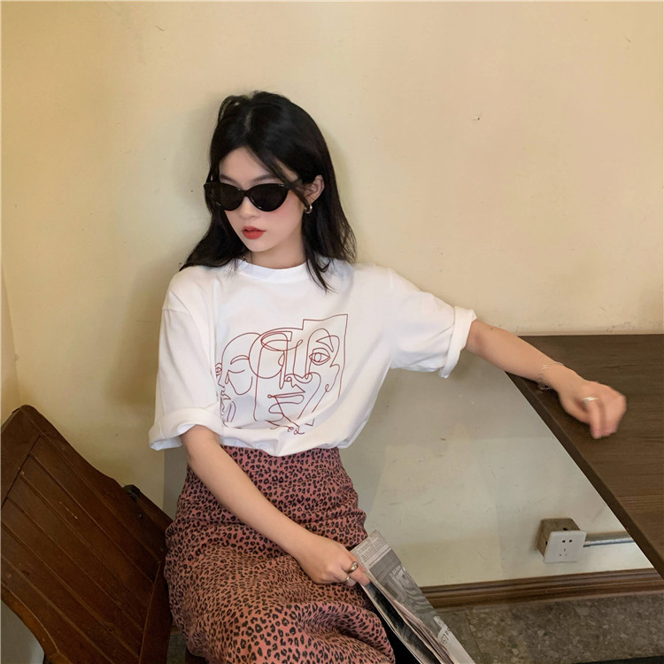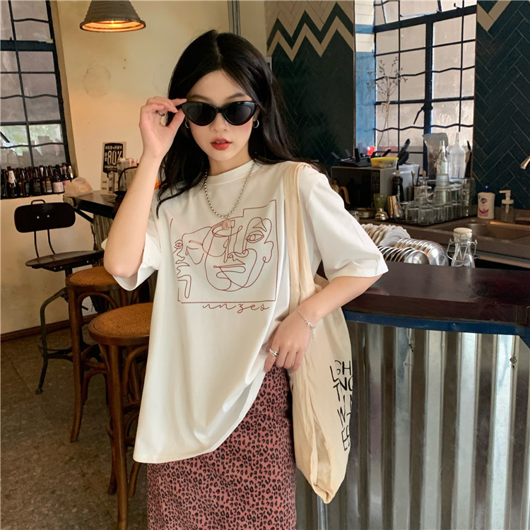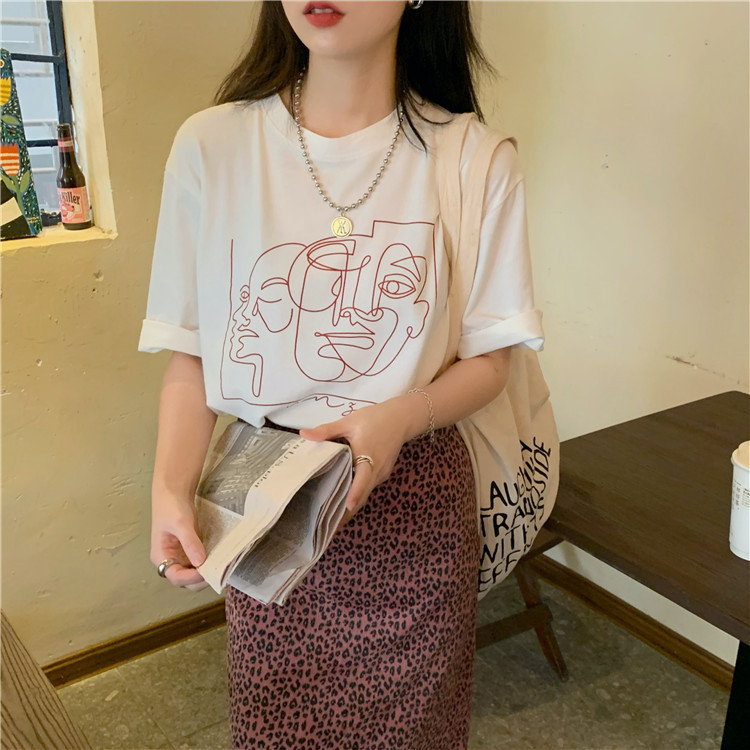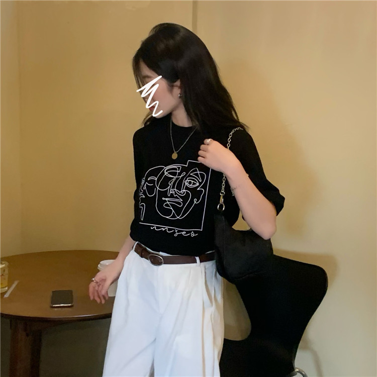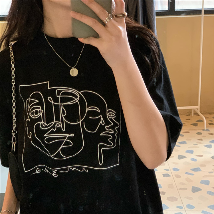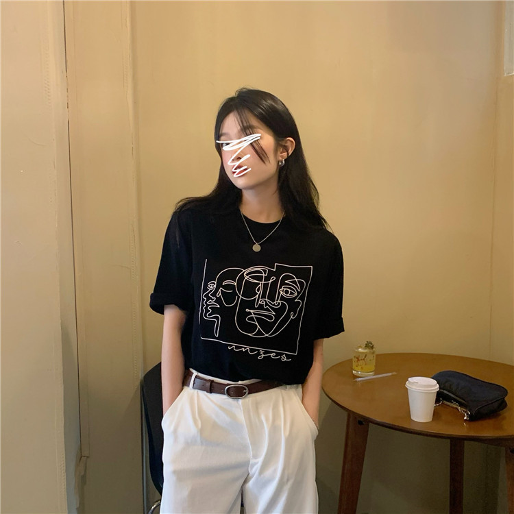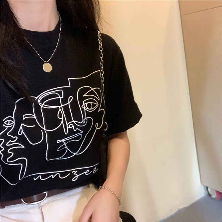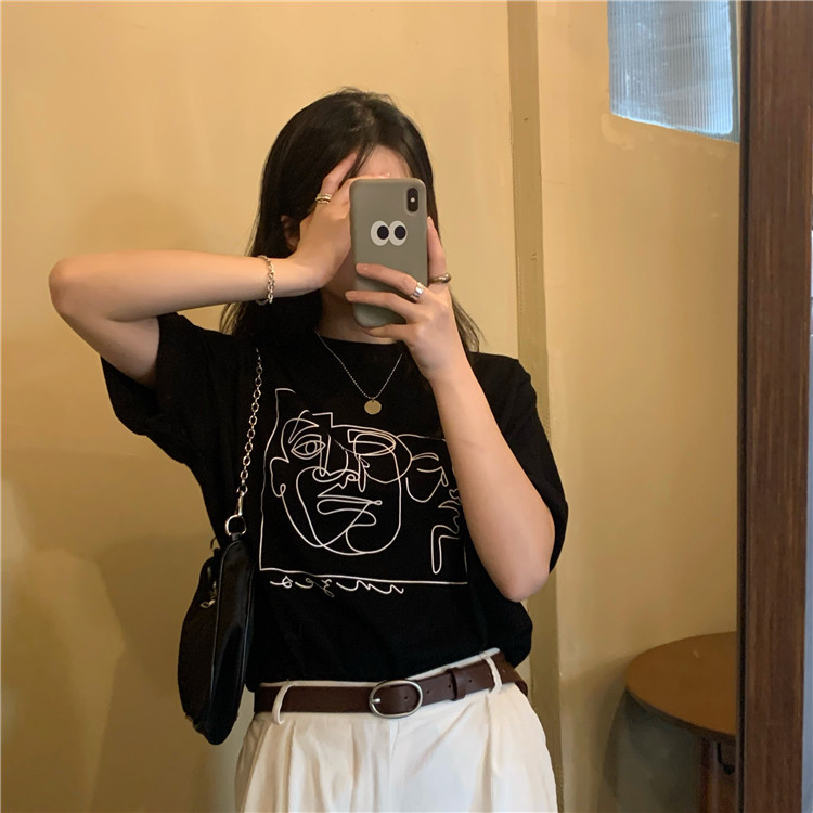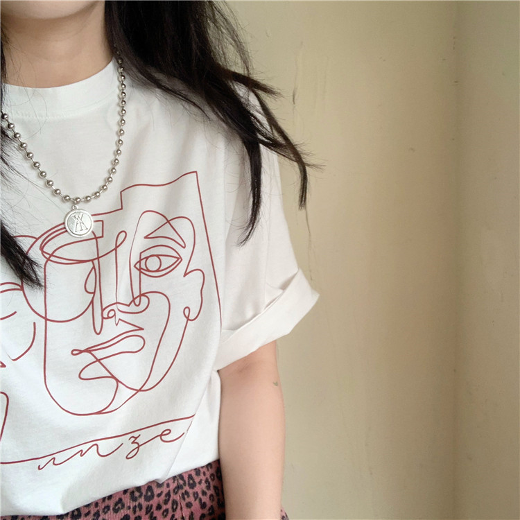 夏季新款ins复古宽松百搭线条印花短袖T恤女内搭圆领打底衫潮