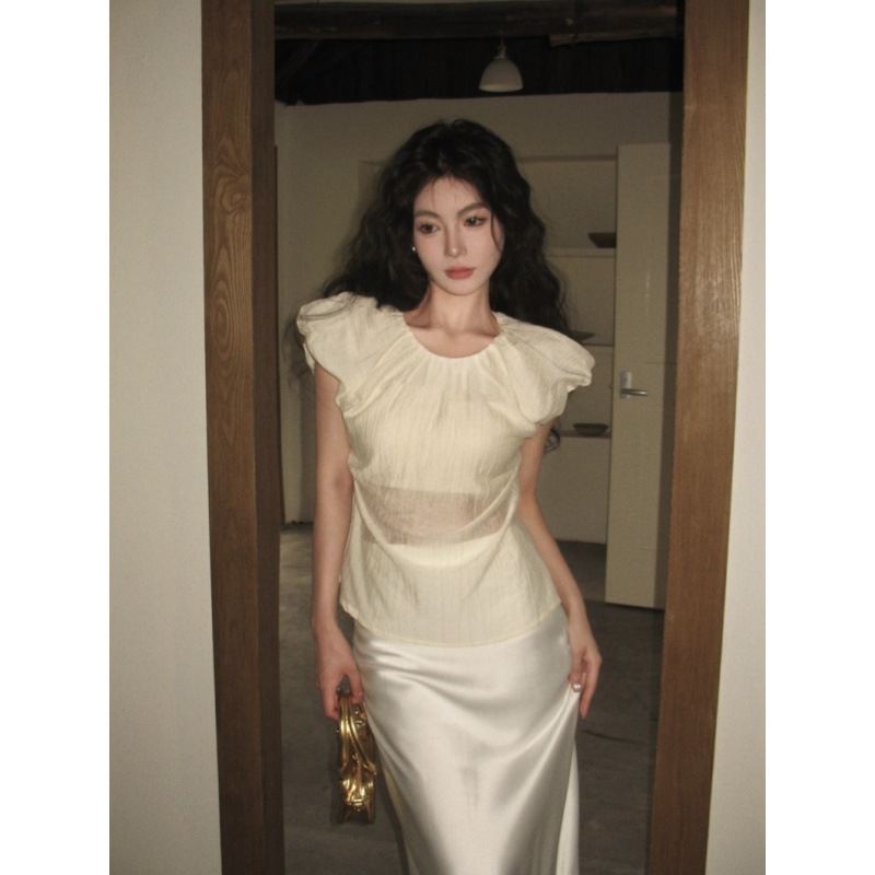 夏季法式气质圆领泡泡袖收腰娃娃衫小心机露腰褶皱无袖上衣