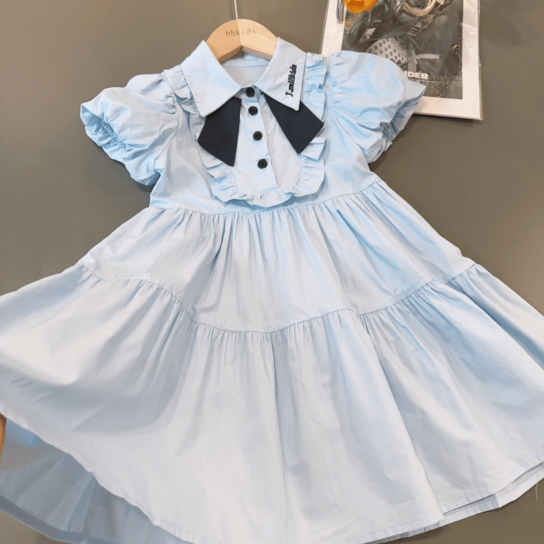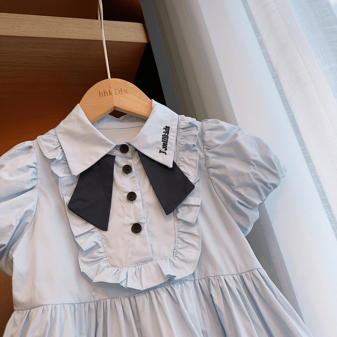 新品女童韩版连衣裙2025夏季新款气质泡泡袖蝴蝶结中小童裙子