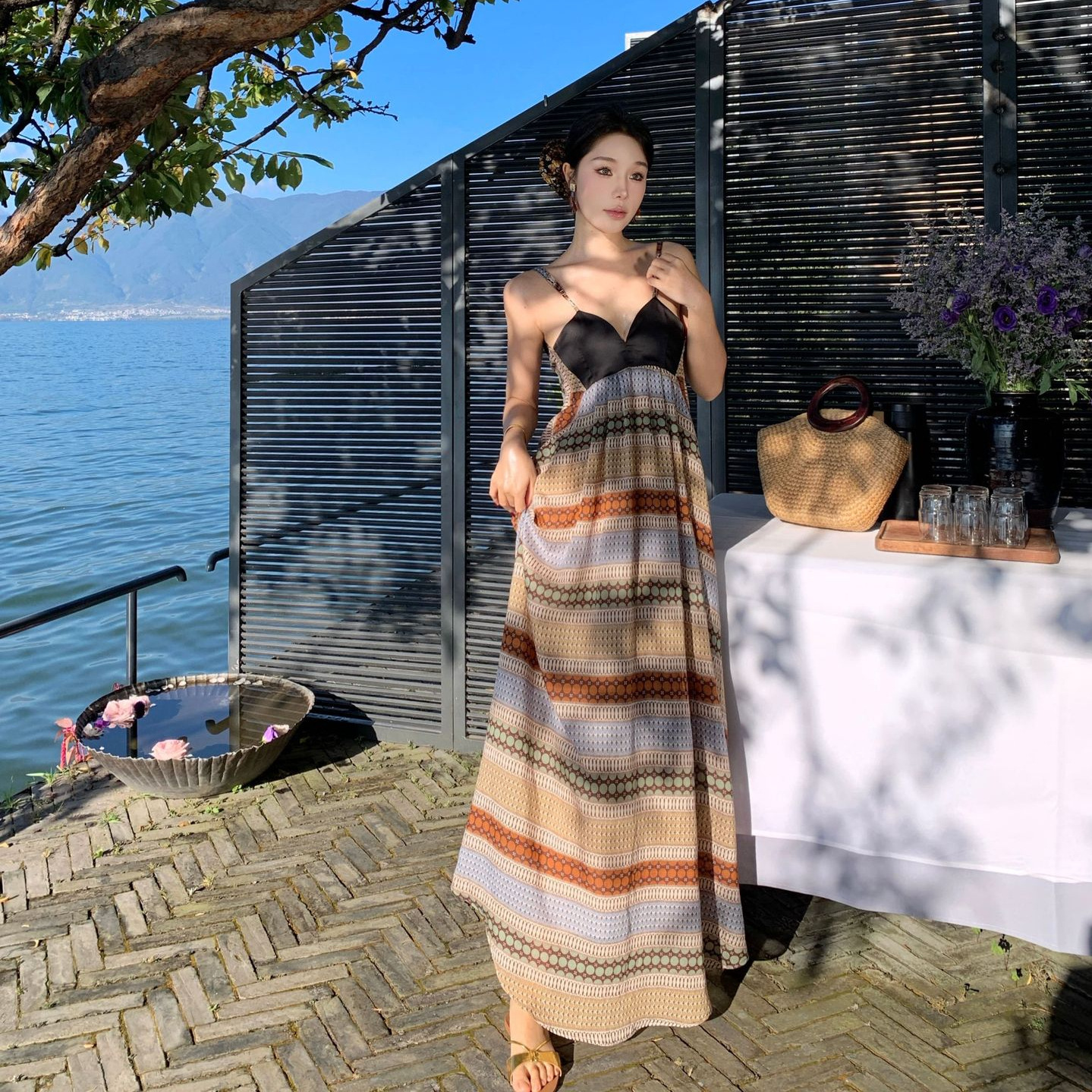 实拍法式v领吊带连衣裙女夏季性感海边度假风印花拼接露背a字长裙