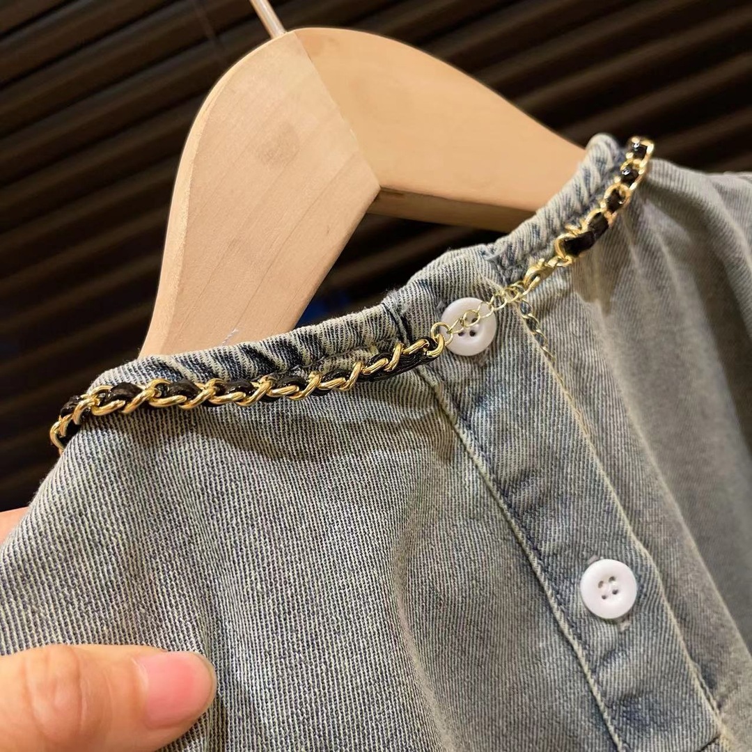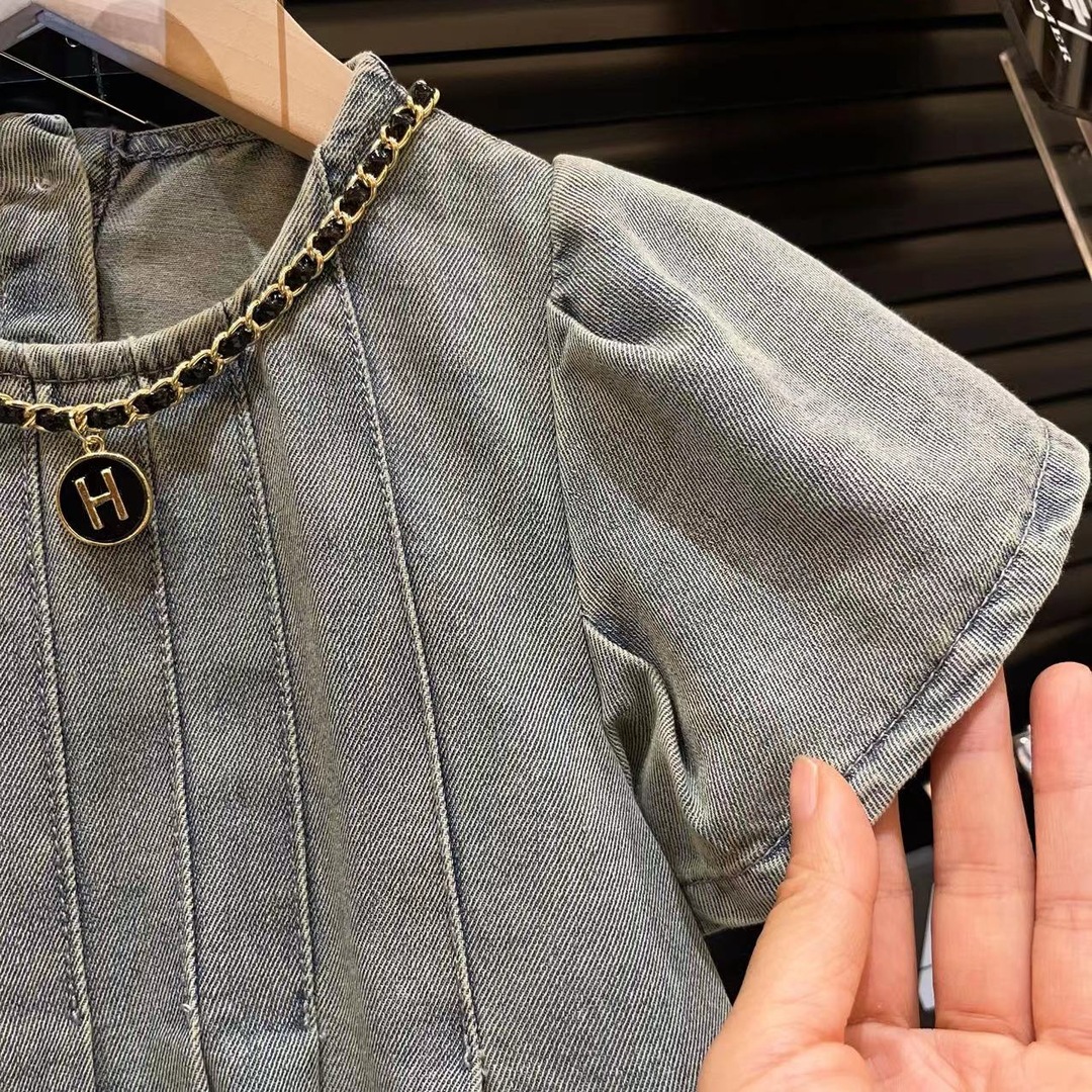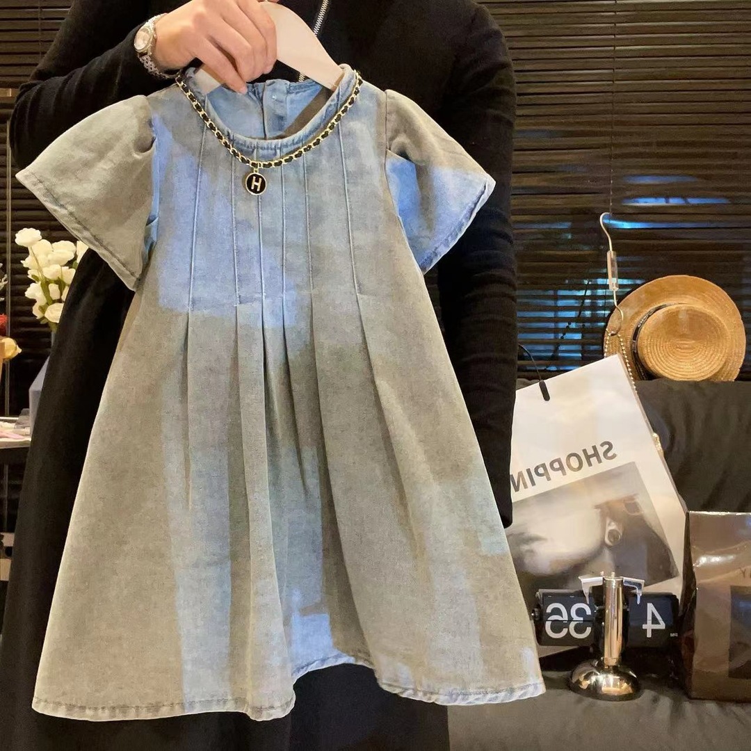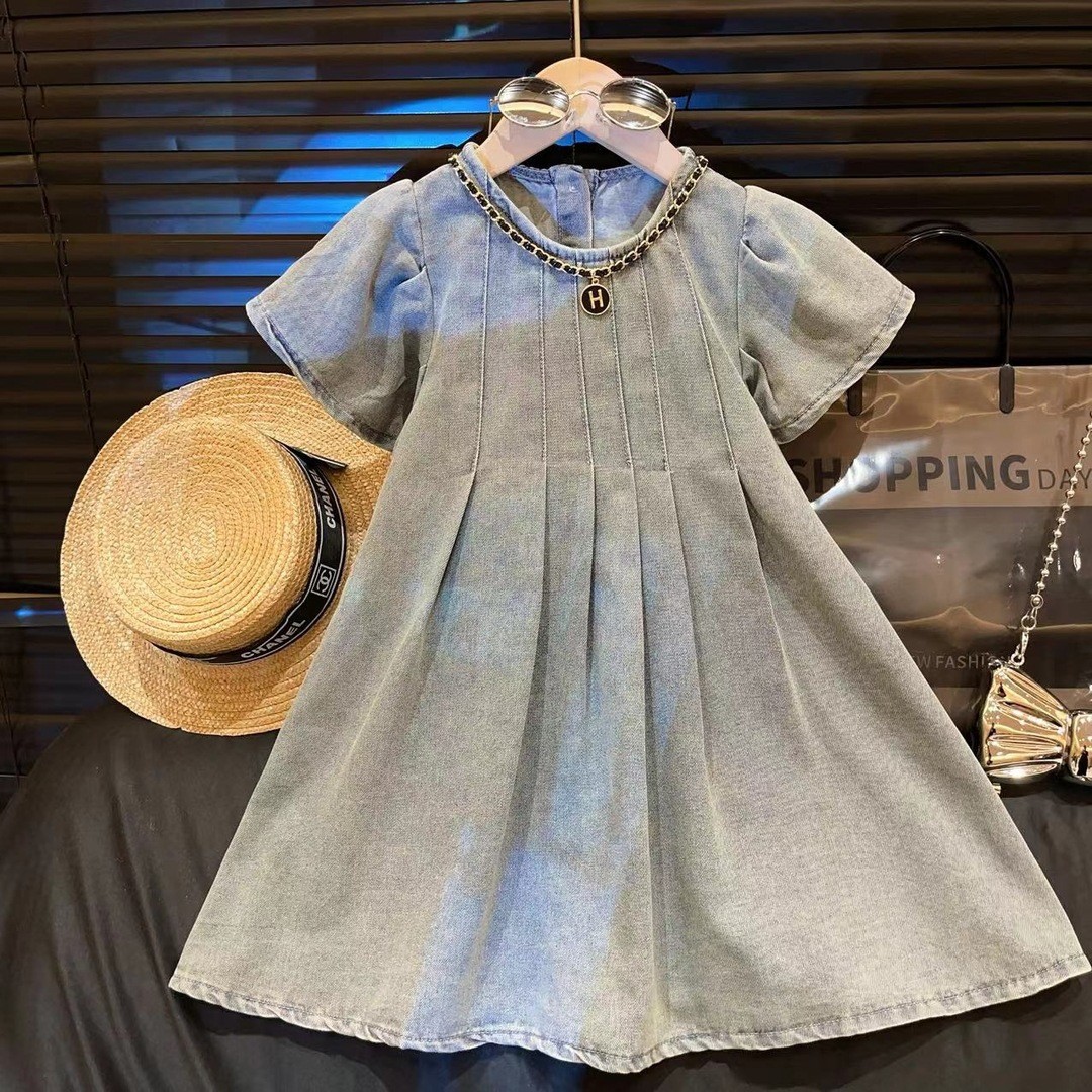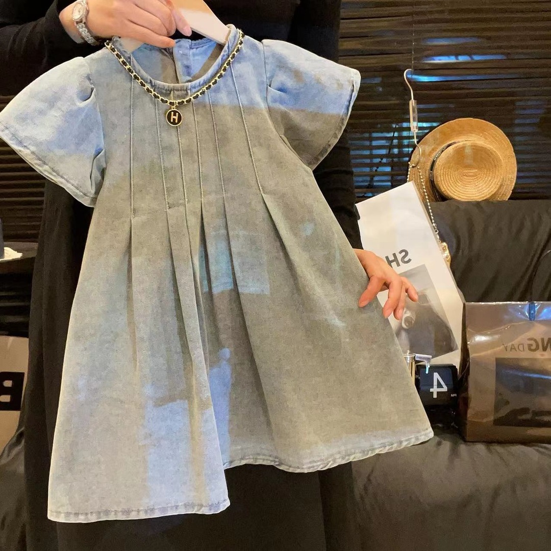 新品儿童百褶连衣裙2025韩版新款圆领短袖韩版休闲水洗牛仔裙