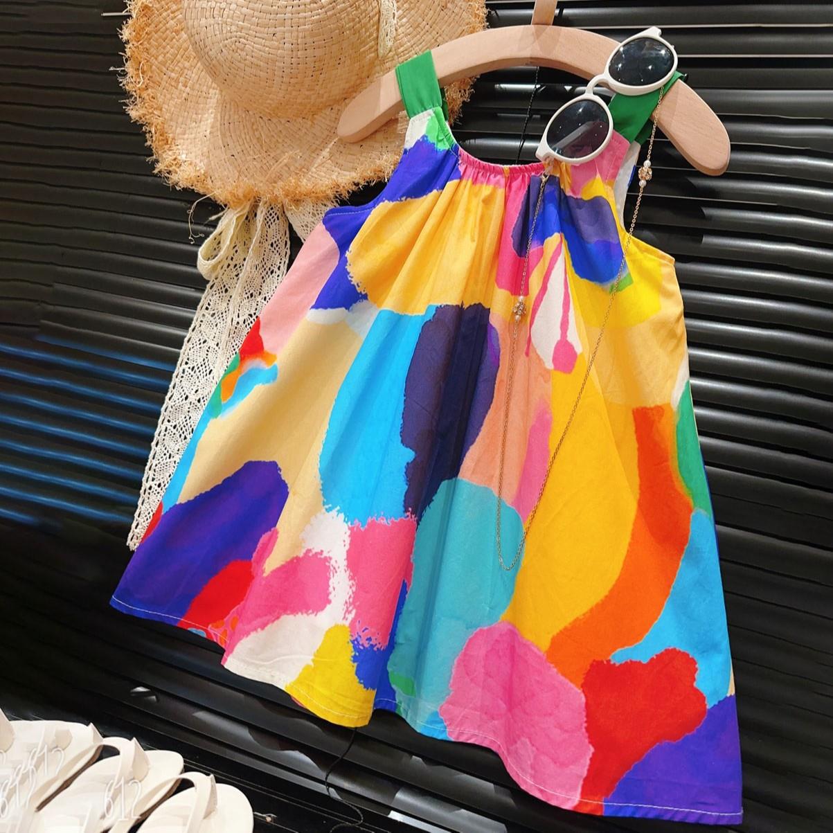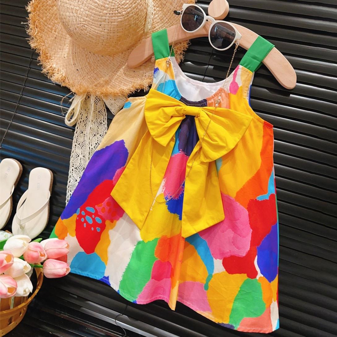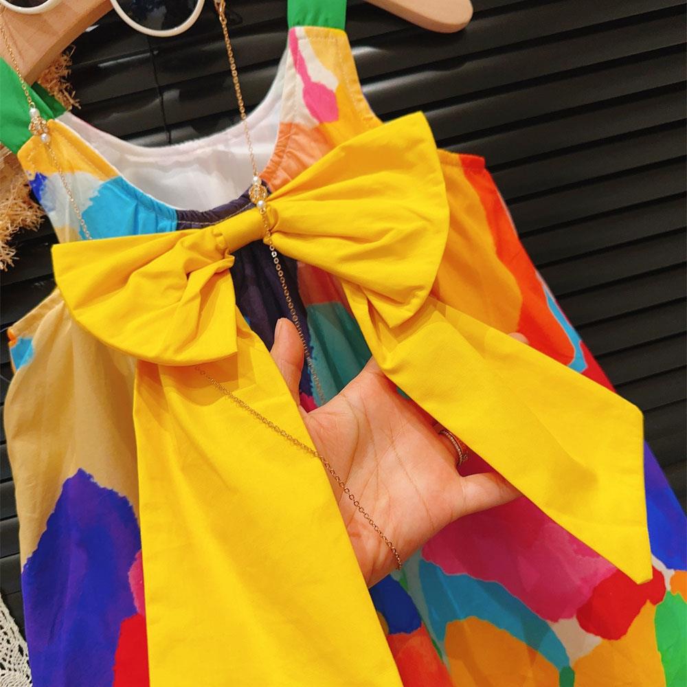 新品女童夏日沙滩风撞色涂鸦蝴蝶结公主背心裙2025夏装连衣裙
