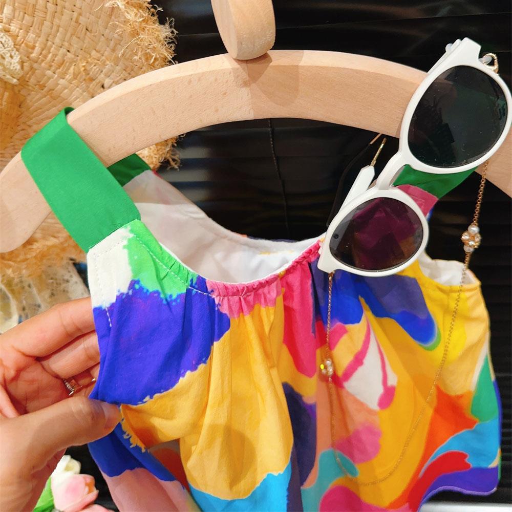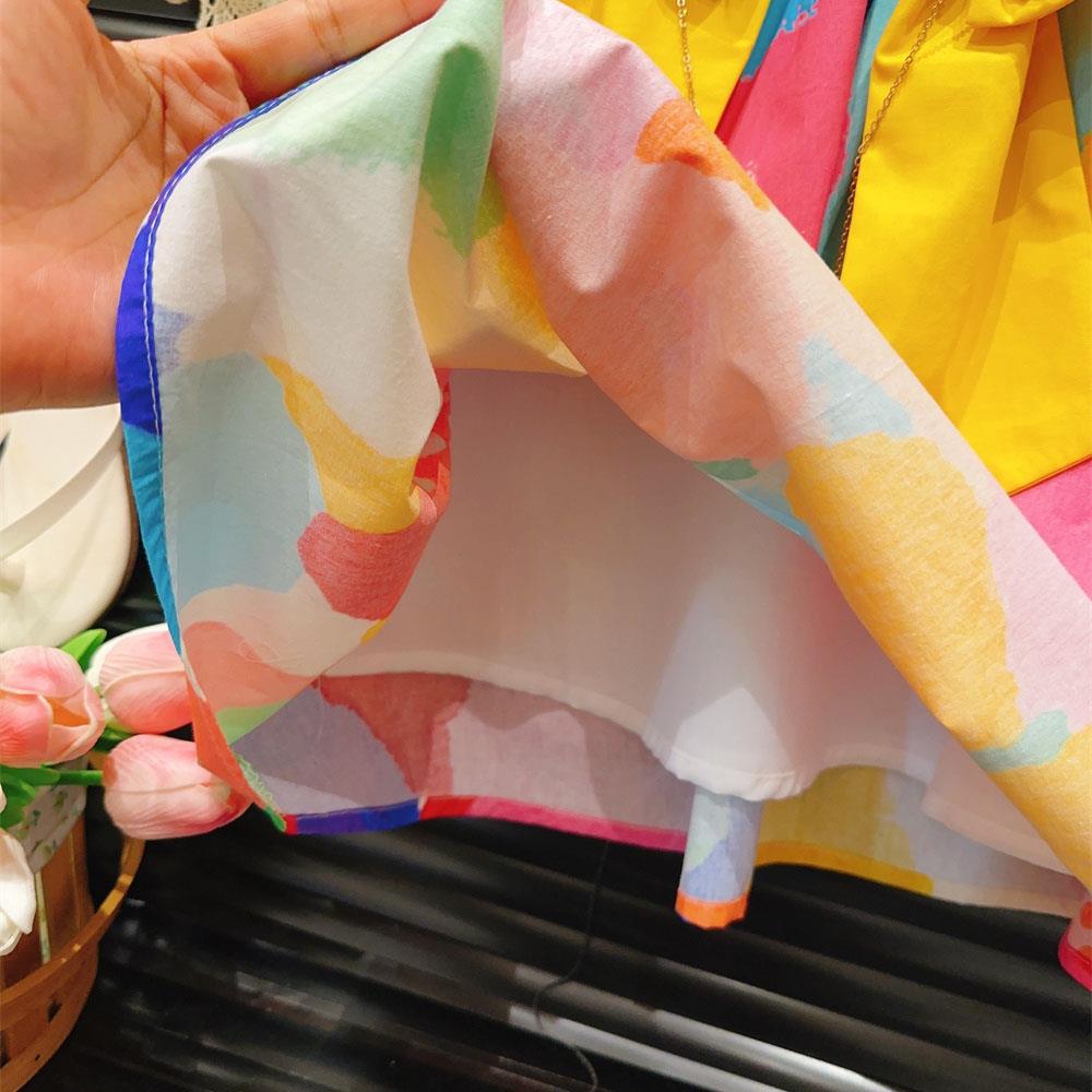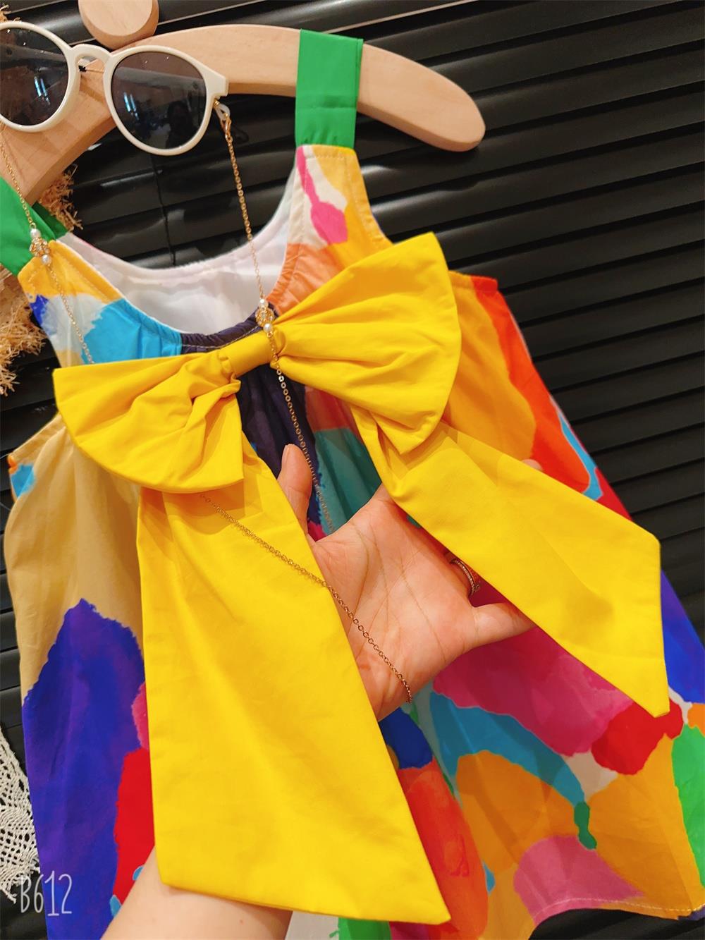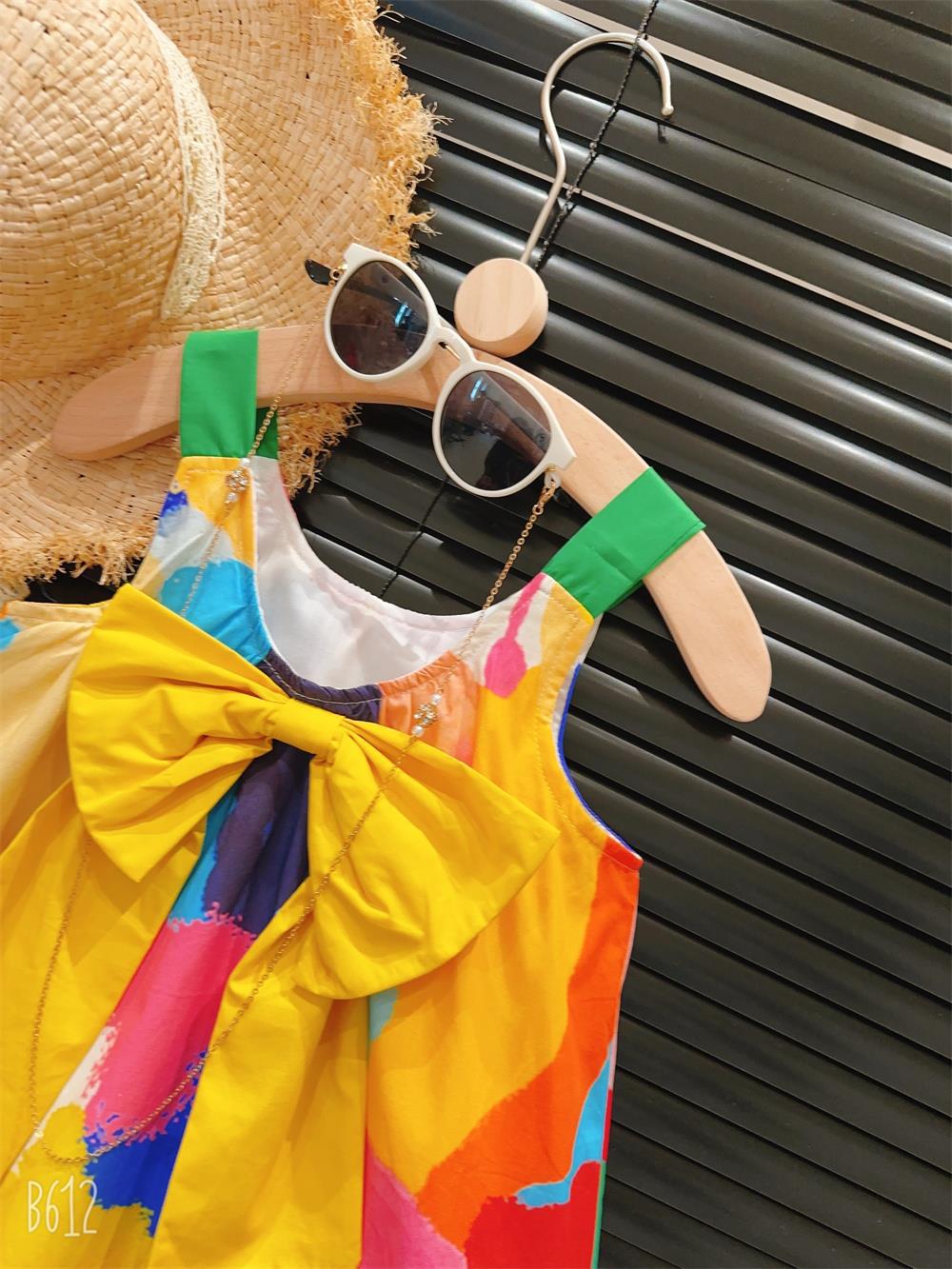 新品女童夏日沙滩风撞色涂鸦蝴蝶结公主背心裙2025夏装连衣裙