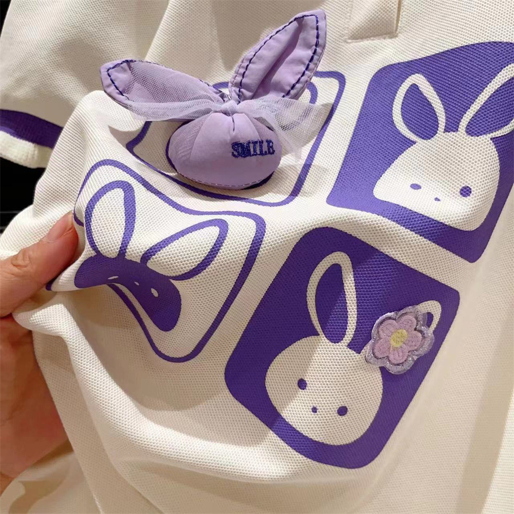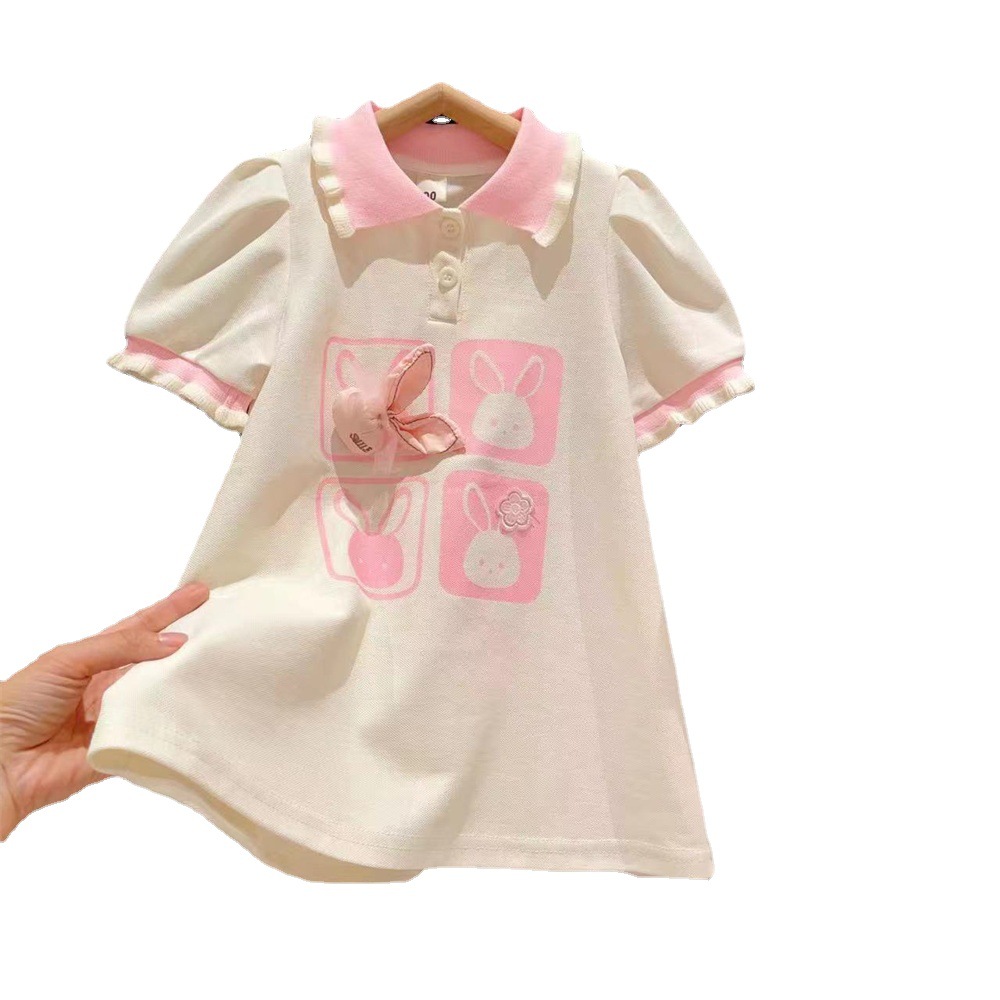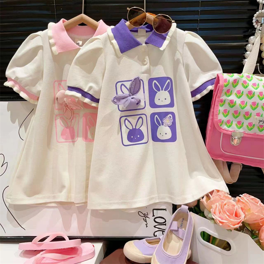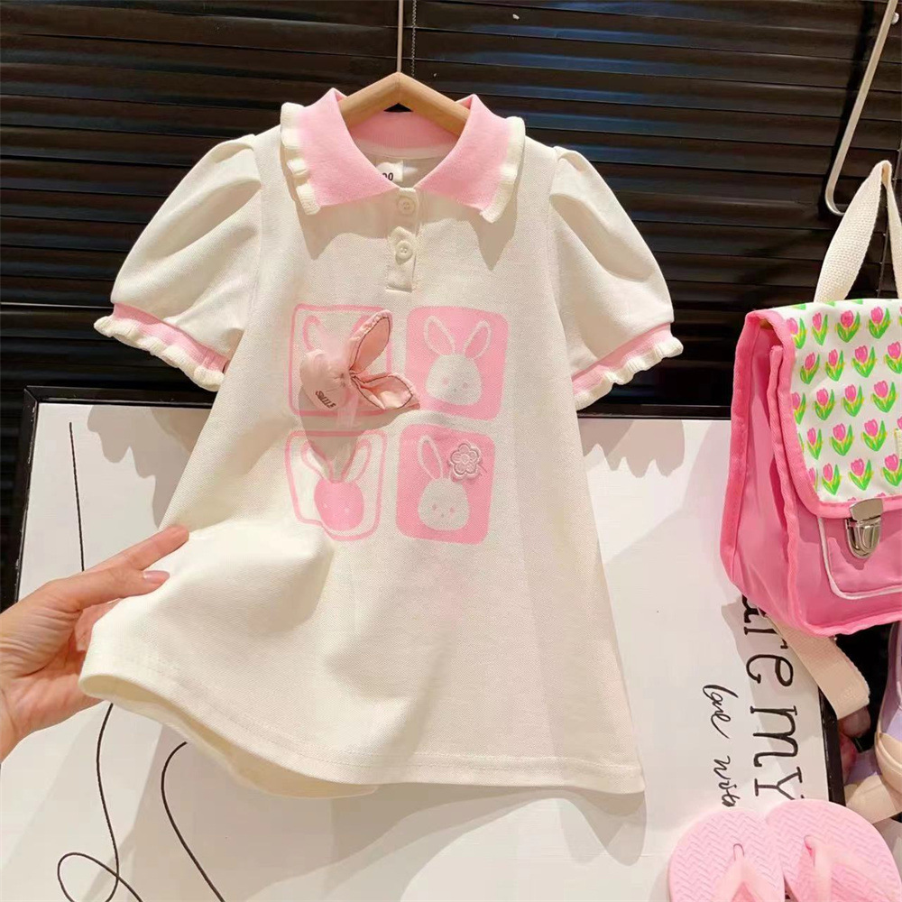 新品女童Polo领卡通小兔印花泡泡袖洋气T恤裙2025夏装连衣裙