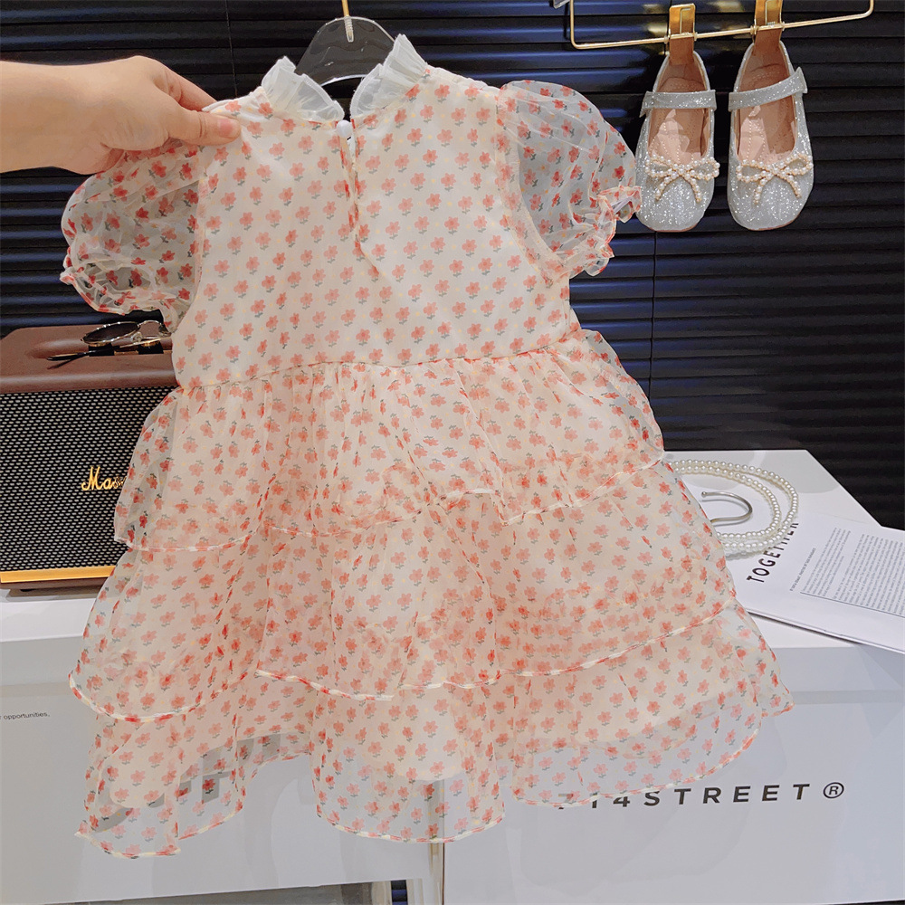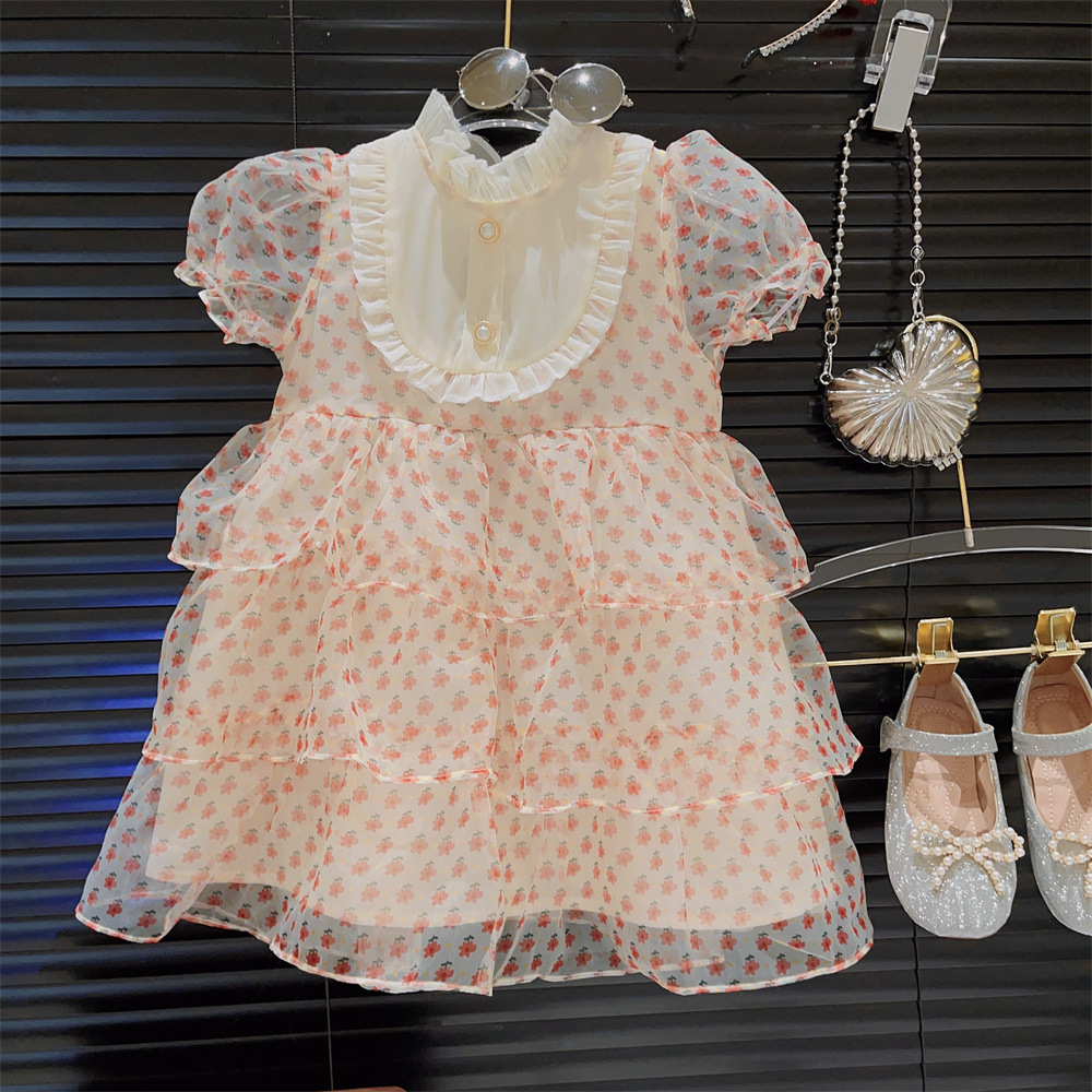 新品女童木耳花边泡泡短袖碎花洋气蛋糕公主裙2025夏装连衣裙