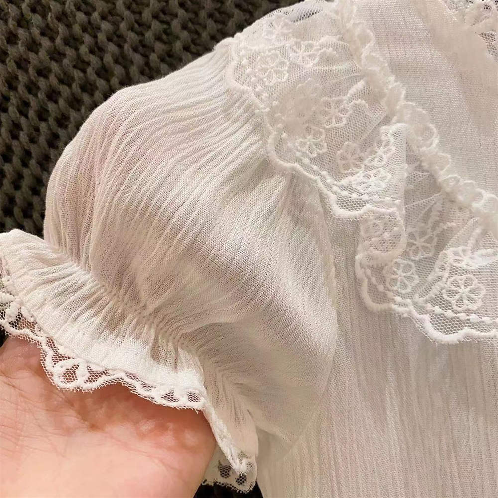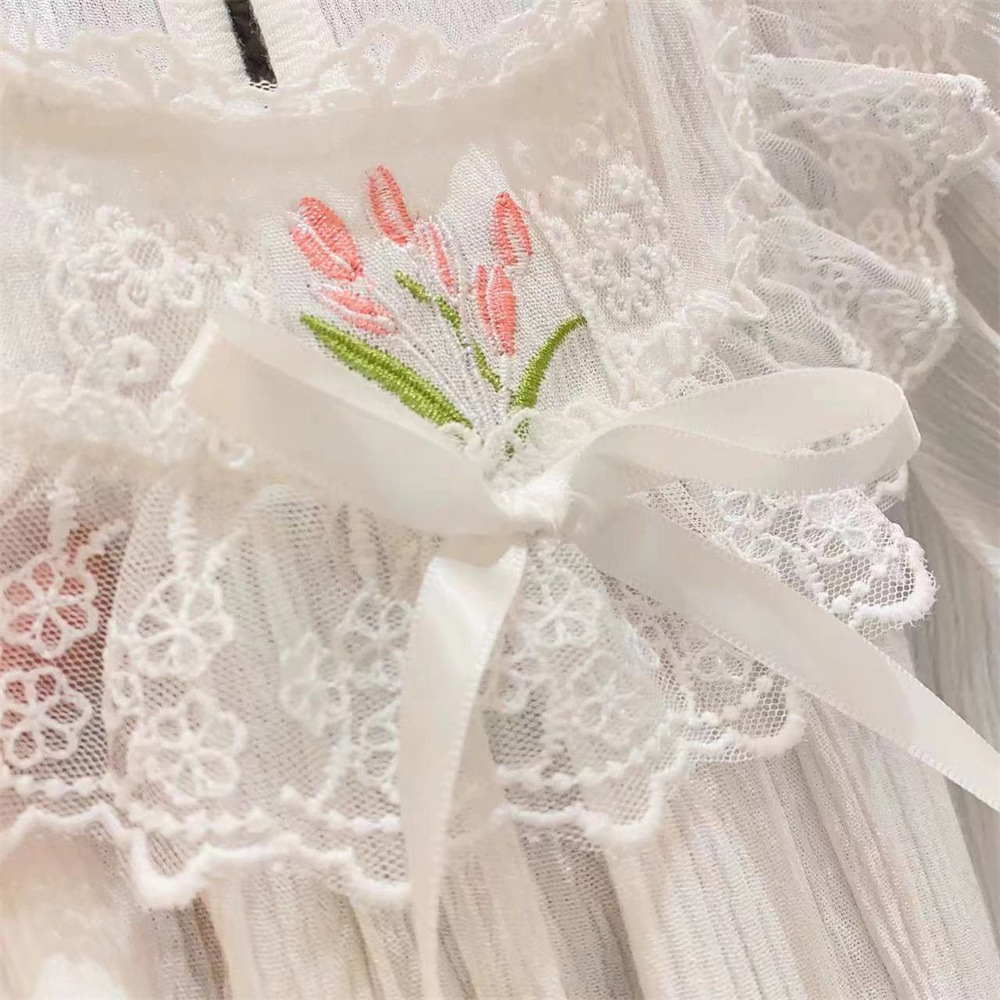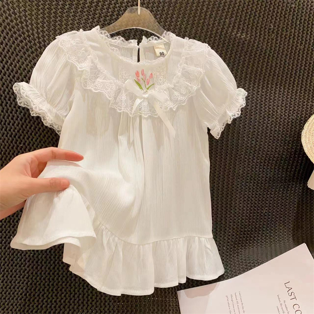 新品女童蕾丝花边喇叭短袖花朵刺绣洋气公主裙2025夏装中小连衣裙