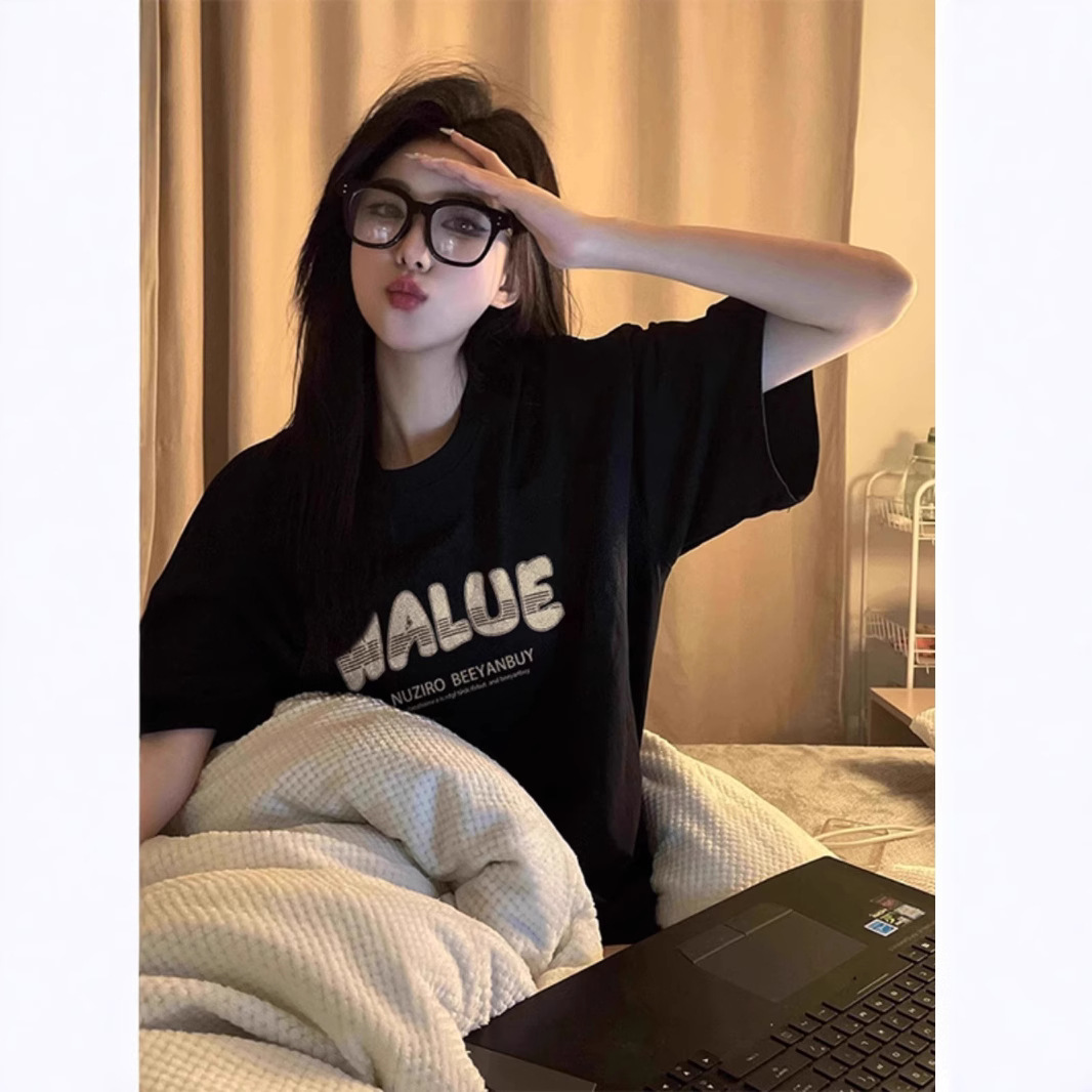 纯棉黑色字母印花短袖t恤女oversize宽松大版夏季新款半袖上衣潮