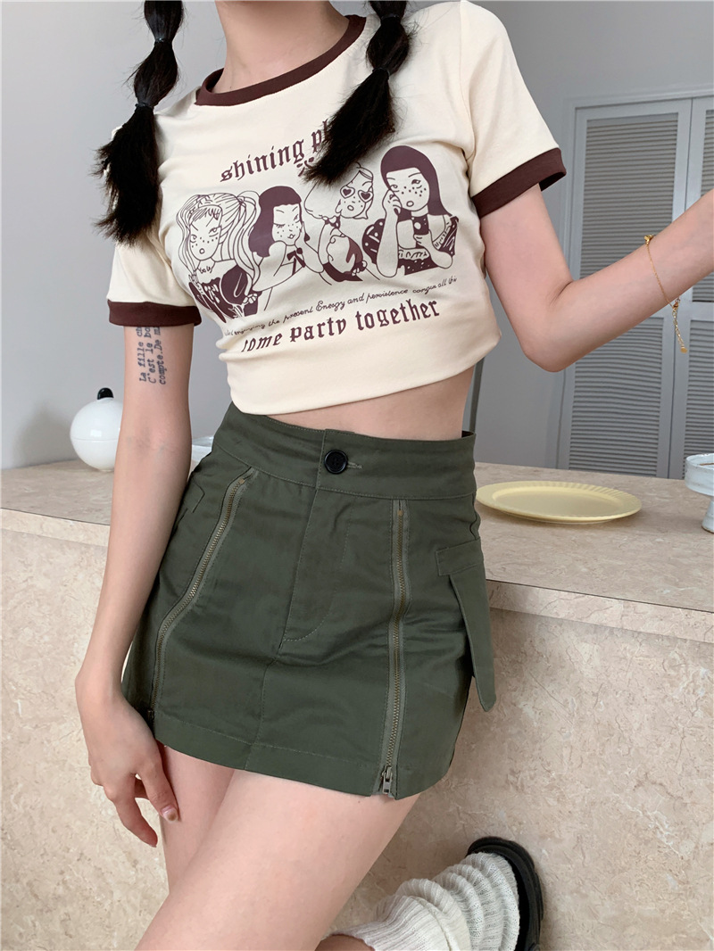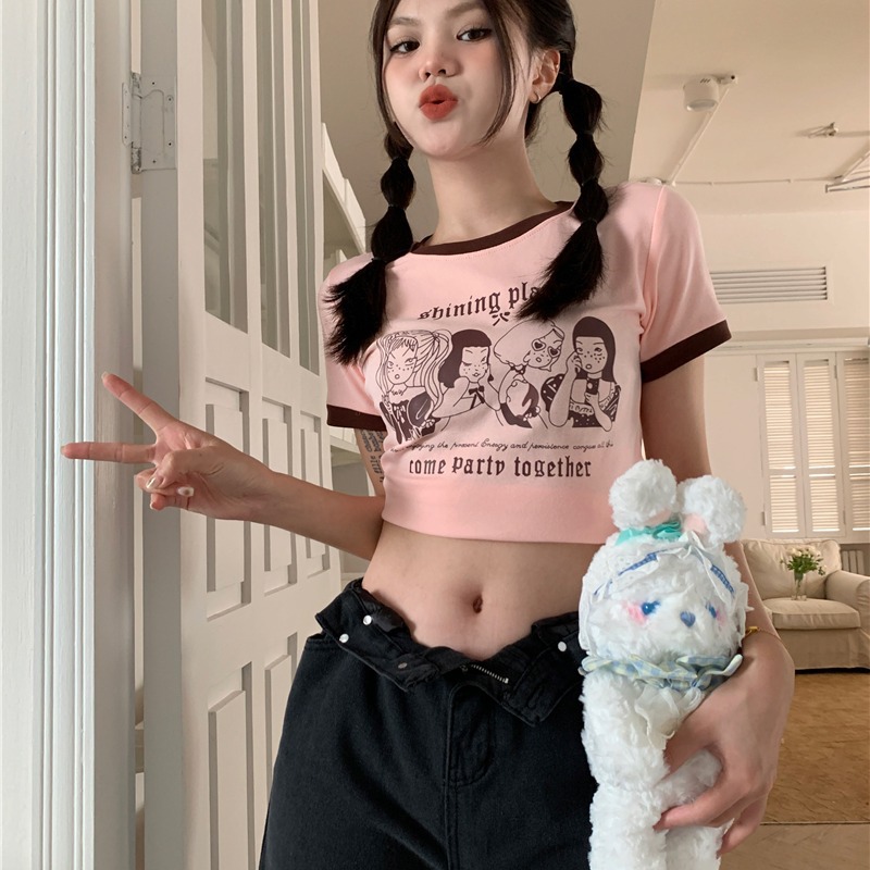 夏季美式复古印花t恤女撞色圆领露脐辣妹修身短款短袖上衣女