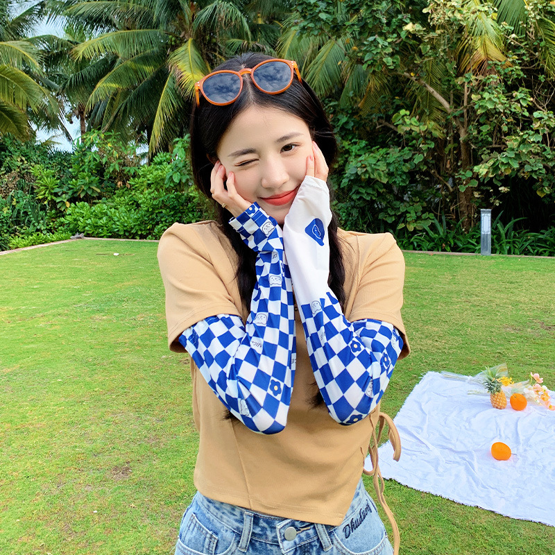 网红笑脸格子冰丝防晒袖套女夏季宽松袖子高颜值冰袖开车护手臂袖