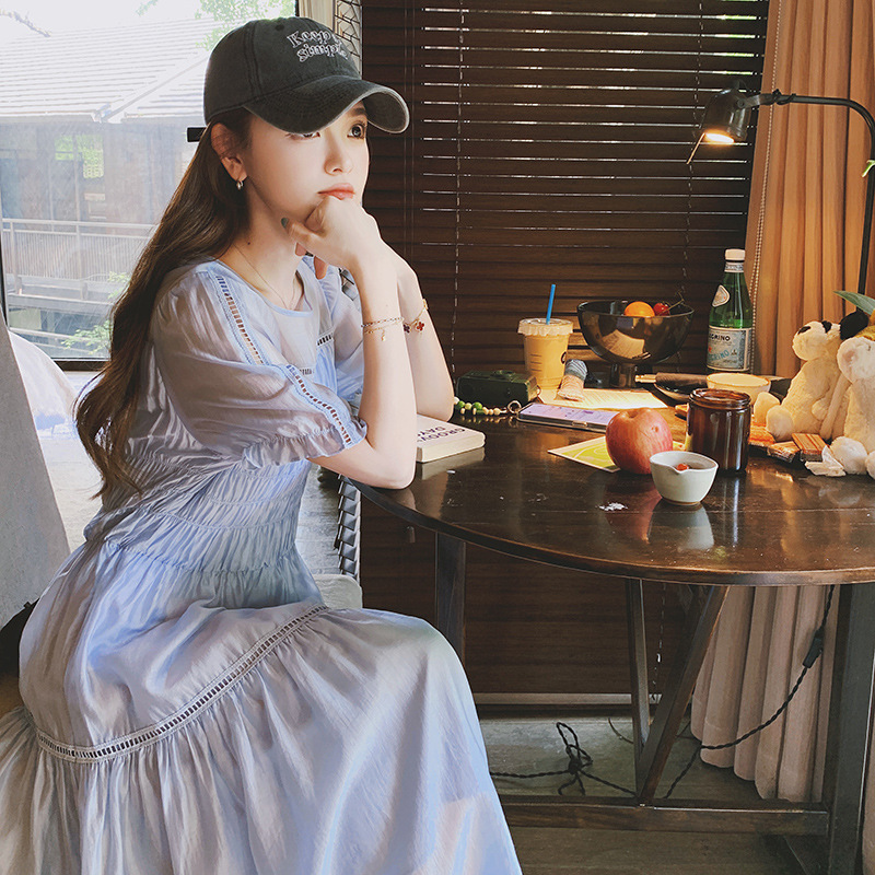 蓝色浪漫复古连衣裙女中长款夏新款收腰显瘦温柔风法式仙女裙