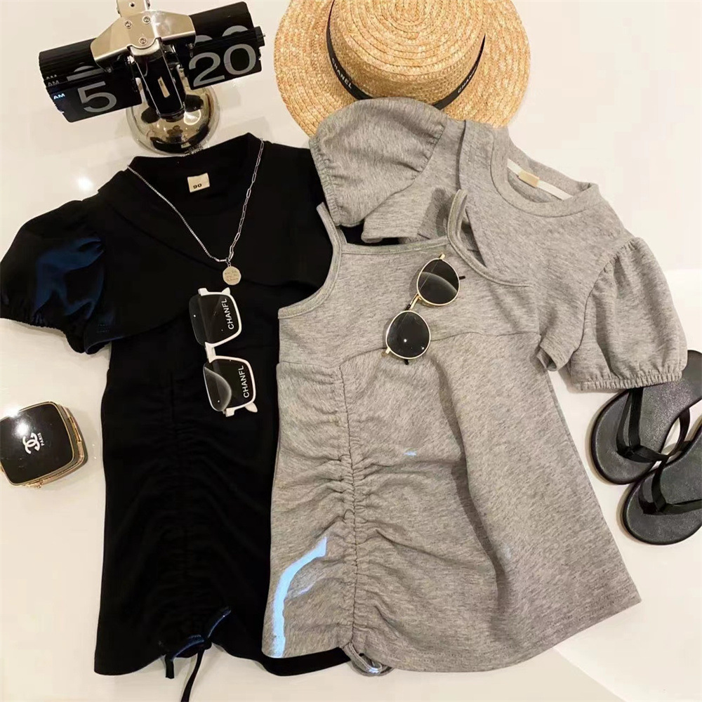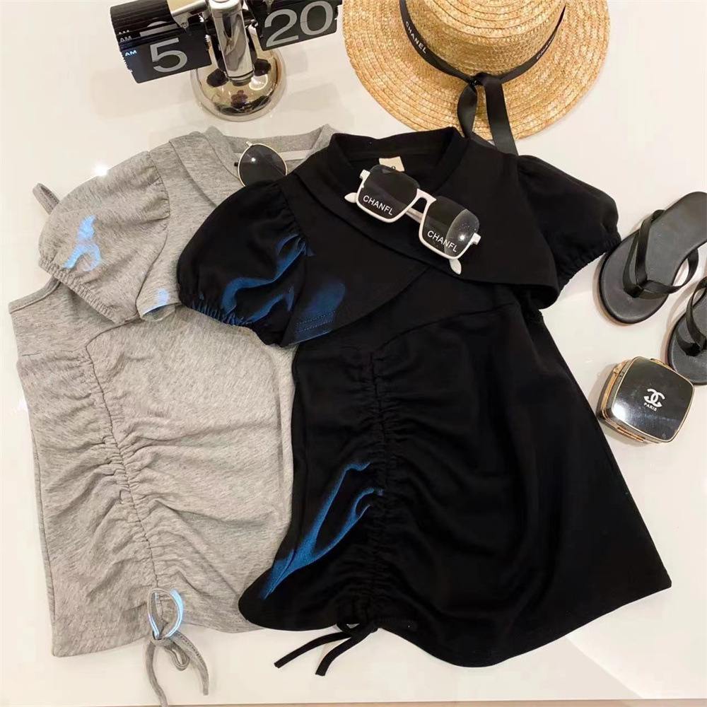 新品女童泡泡短袖短款外套系带松紧吊带裙两件套2025夏装