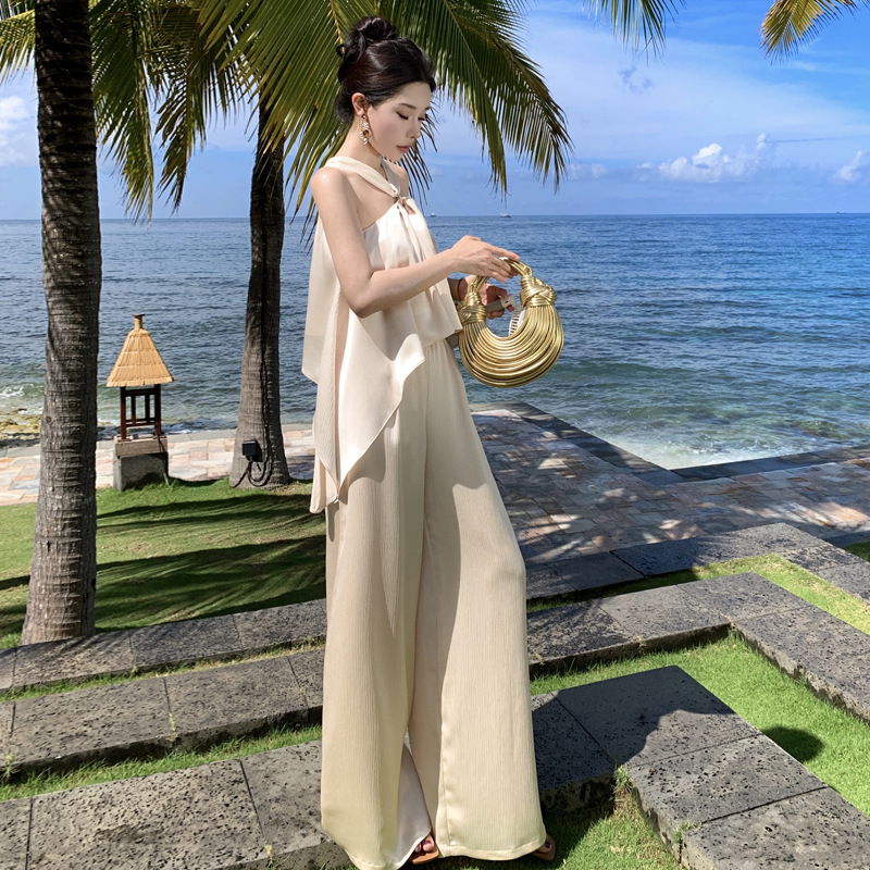 法式度假千金风挂脖衬衫女夏季新款时尚高腰宽松阔腿裤两件套