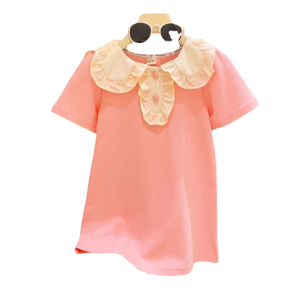 新品女童公主风花边领拼接短袖洋气淑女连衣裙2025夏装连衣裙