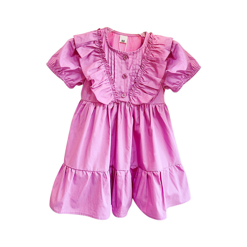 童装2025夏季新款韩版女童短袖拼接荷叶边紫色连衣裙 不送帽子