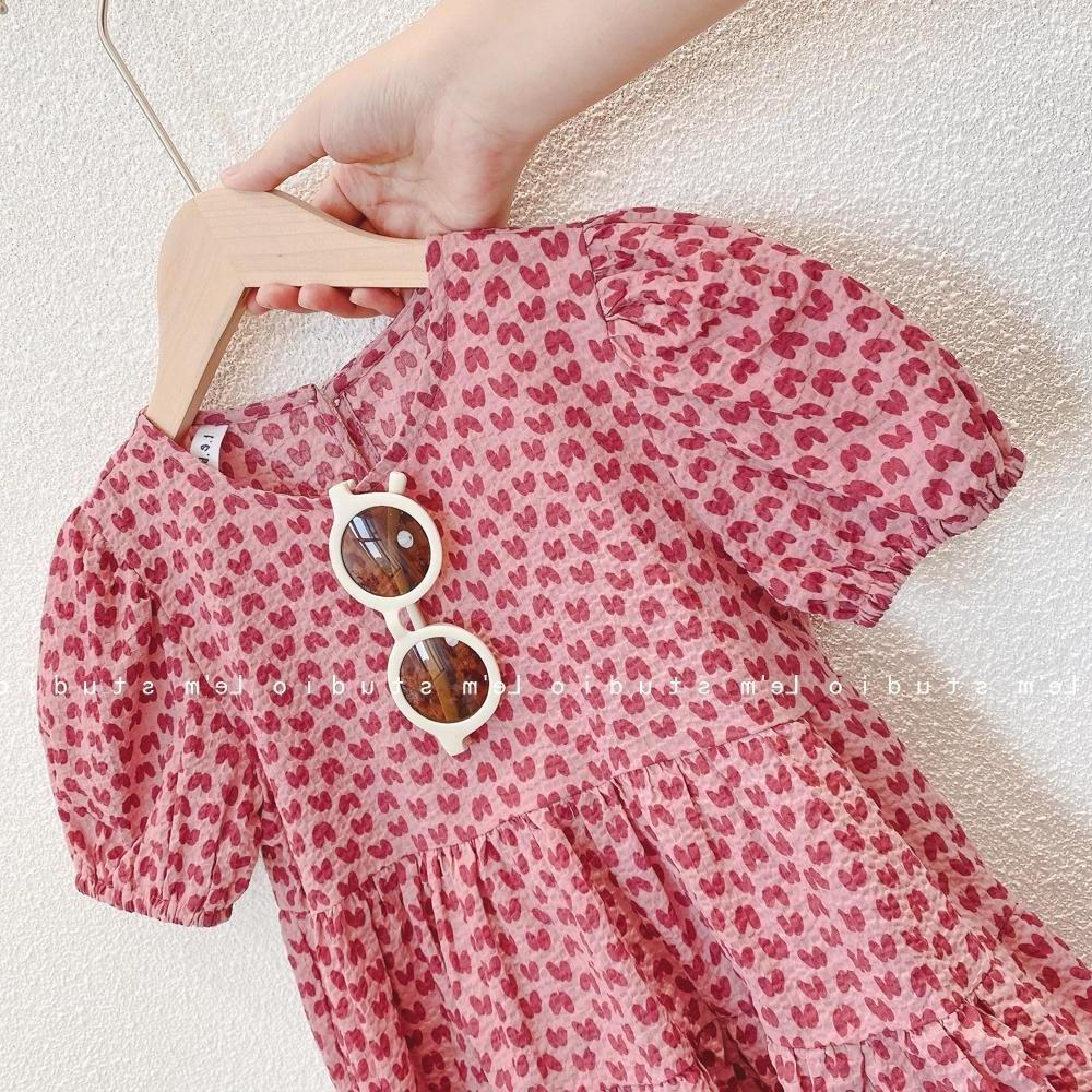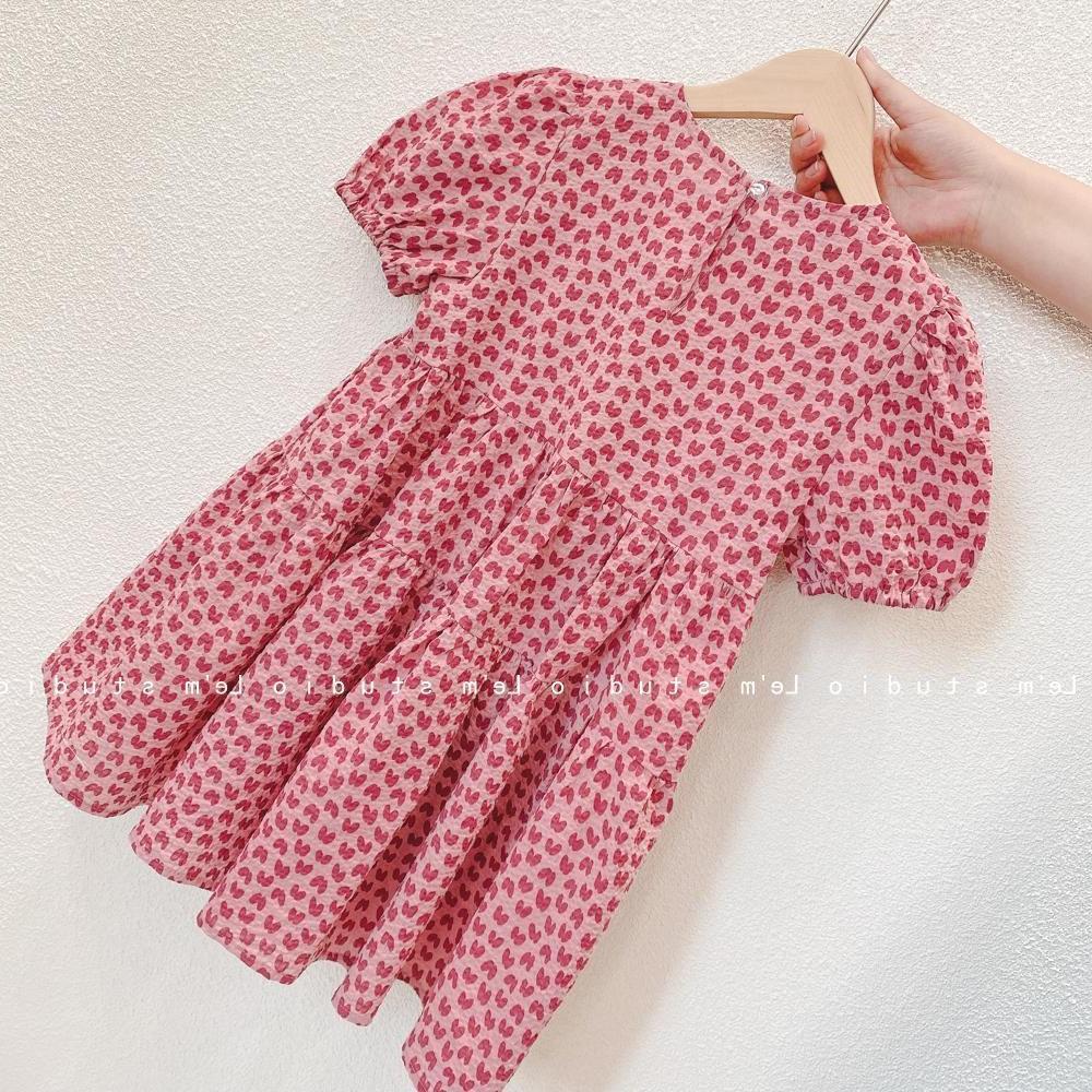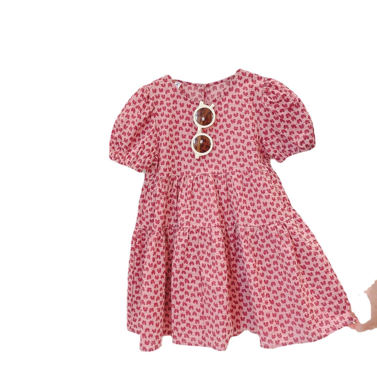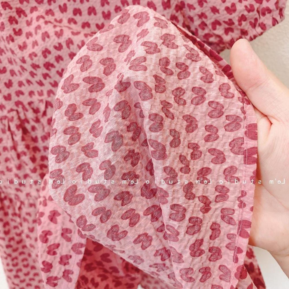 2025夏季新款连衣裙女童时髦棉麻压皱设计满印爱心短袖裙子潮