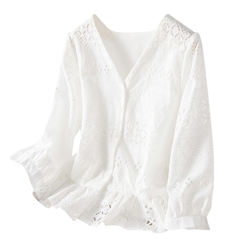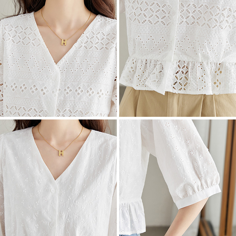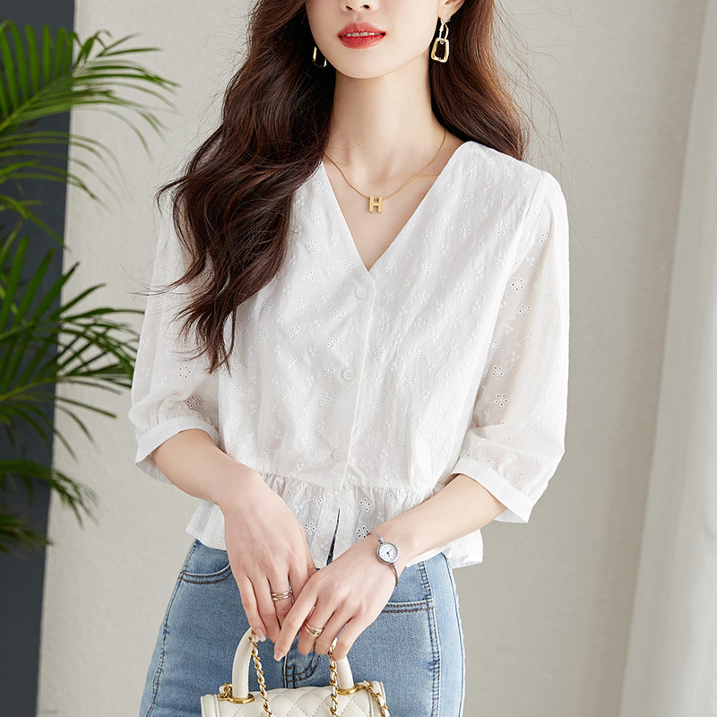 绣花镂空白衬衫女五分袖夏季新款小个子短款上衣纯棉v领衬衣