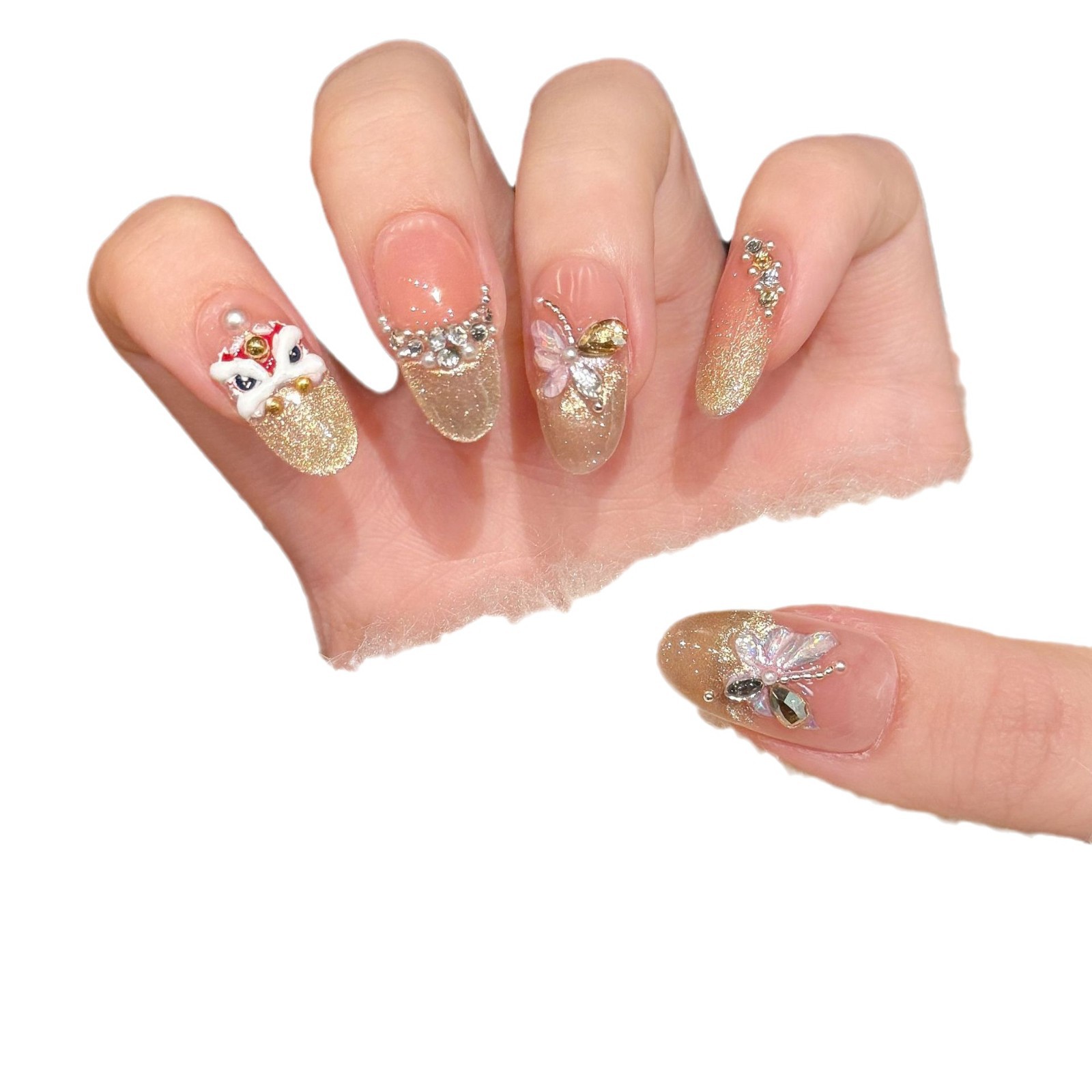 【艺禾-烫金醒狮】 爆款新年款招财蝴蝶金色碎钻猫眼纯手工穿戴甲